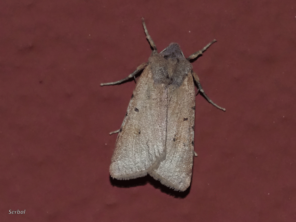 Color general rojizo o castaño, pero también puede haber formas grises o amarillo pálido, con variaciones en los tonos de unos a otros ejemplares; borde alar con tres marcas negras en la costa y otra en forma de cuña difusa próxima a banda subterminal, sobre el anverso del ala anterior dos marcas reniformes, una media más pequeña oblicua y otra en tercio distal más grande y transversa, el interior de estas marcas suele ser más oscuro que el entorno, punteado negro subterminal al final del ala; alas posteriores grises con franja terminal oscura.