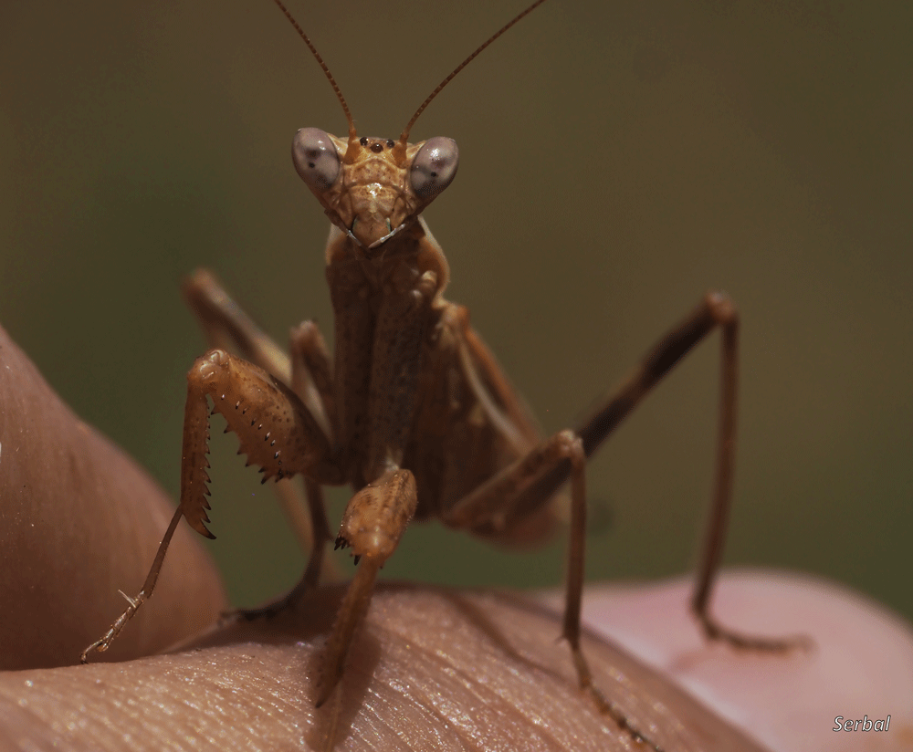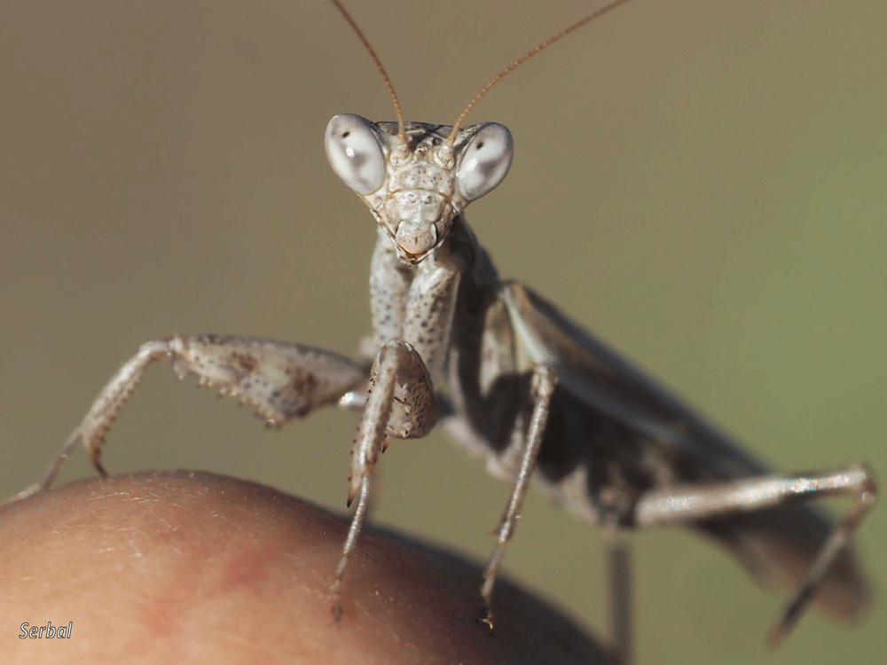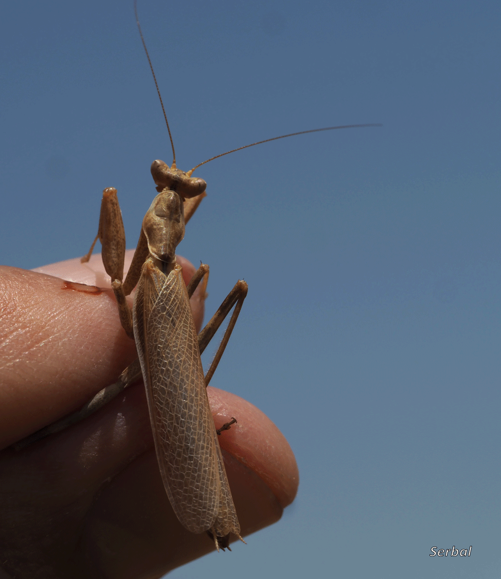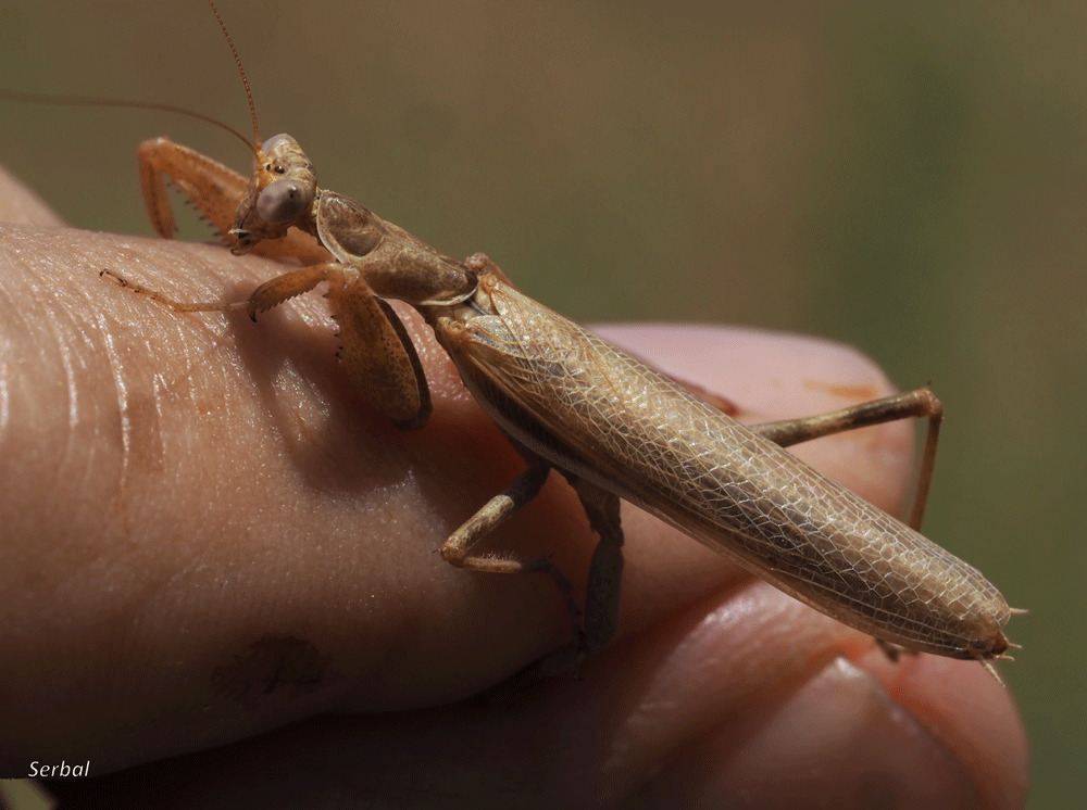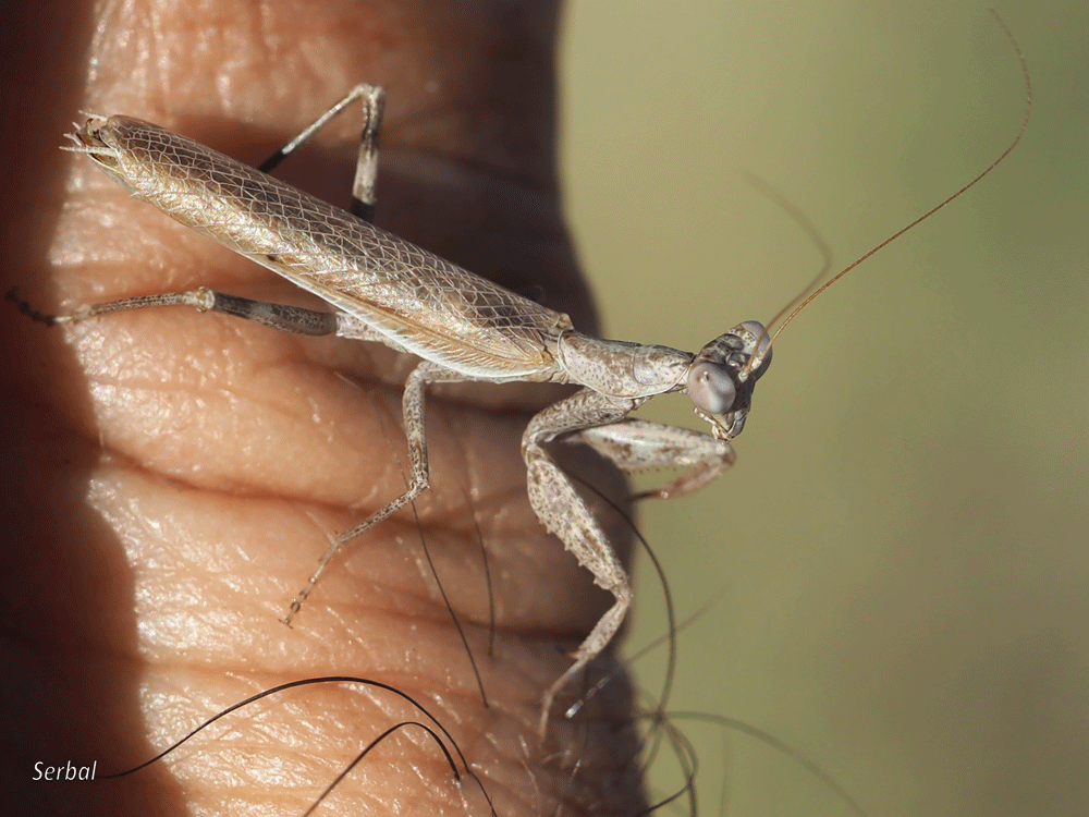 Esta preciosa y pequeña mantis tiene una imagen sugerente, aunque pequeña llama la atención por su cuerpo curvado y el abdomen abultado en la hembra que no vuela, el macho tiene el abdomen recto y sin abombamiento, y es capaz de volar cuando se le molesta. El pronoto es ancho y corto, también debemos ver las patas delanteras transformadas en pinzas que son anchas y cortas.