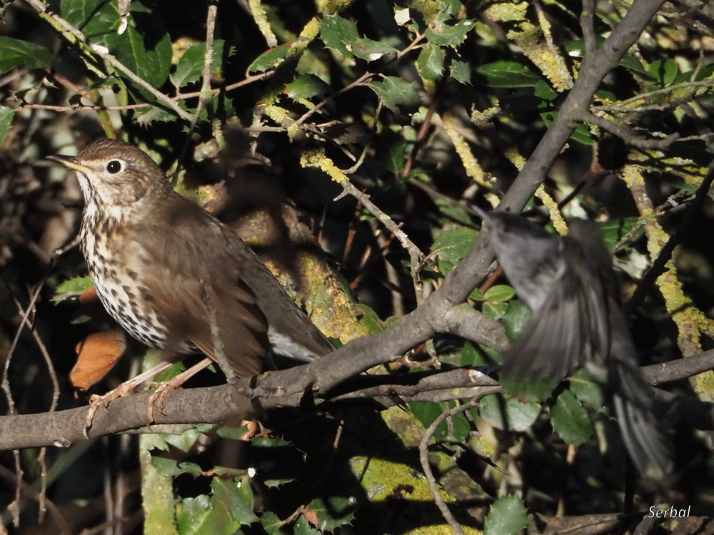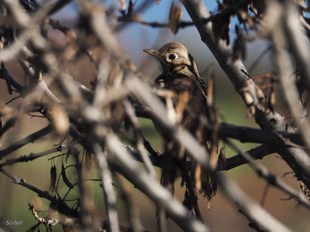 En primavera antes de irse suele cantar en posadero discreto dentro de un árbol o arbustos y tiene un canto aflautado que nos recuerda a otros túrdidos, pero menos elaborado.