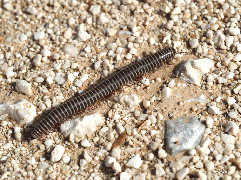 Hasta 5cm, especie de milpiés de cuerpo cilíndrico gris, claramente marcados los anillos y segmentado con dos pares de patas en cada anillo. Presenta entre 45 y 55 anillos y entre 72 y 102 pares de patas; antenas muy cortas y especie de labio inferior, patas color morado.