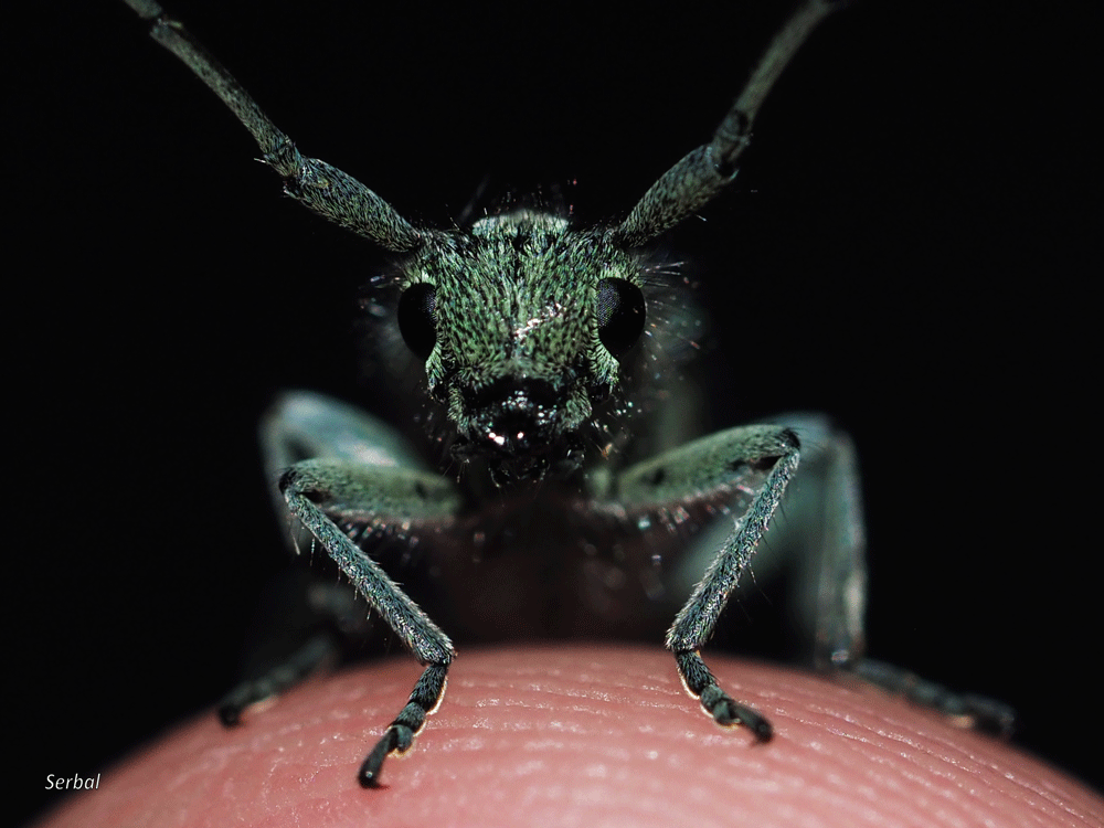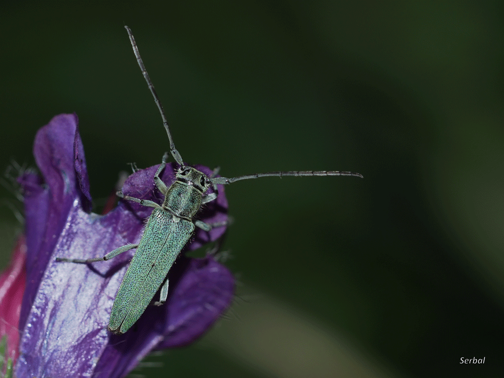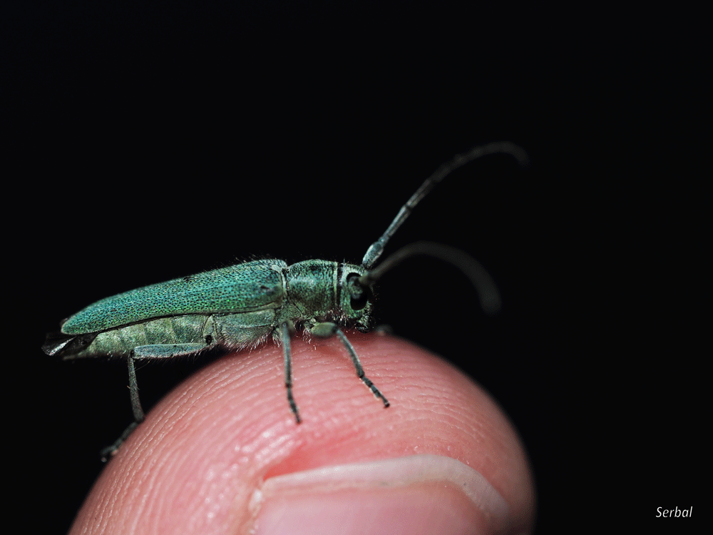 6-13 mm. Pequeño escarabajo de la familia de los Cerambícidos de color turquesa. Vive en centro y sur de Europa, norte de África y Asia menor.