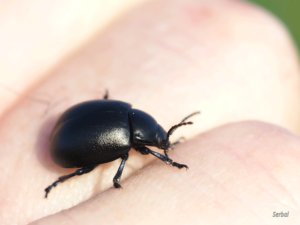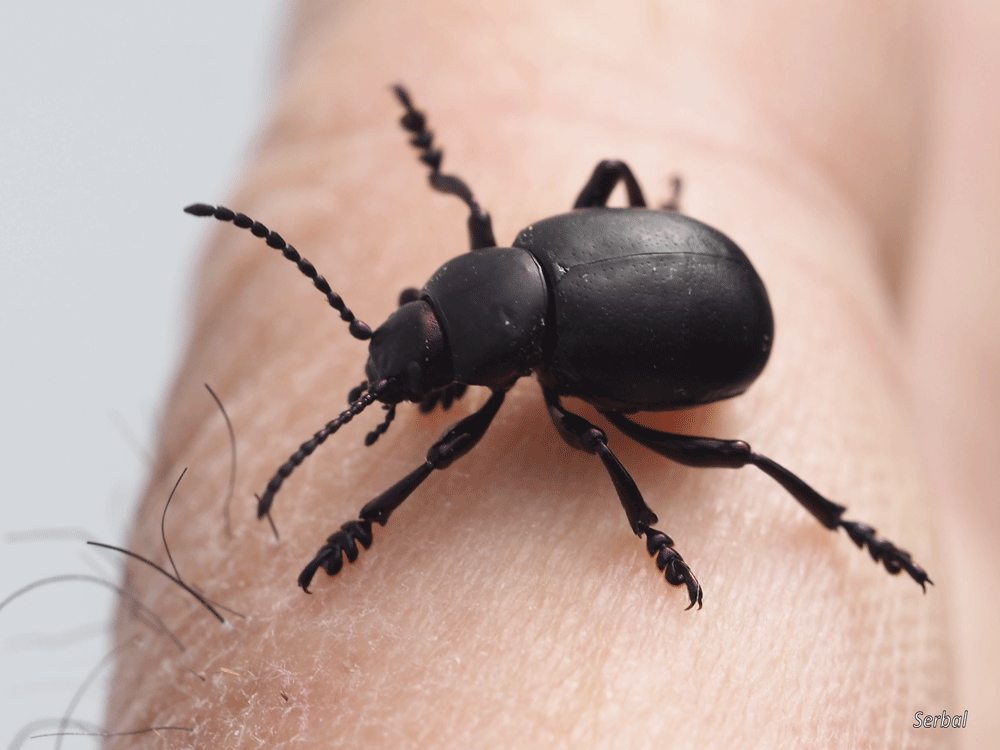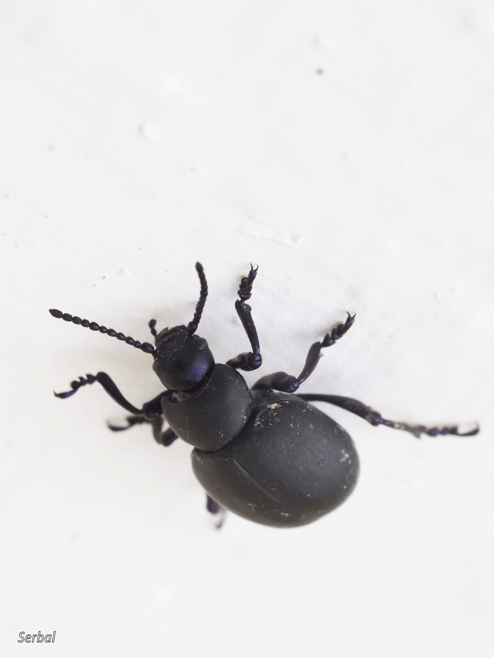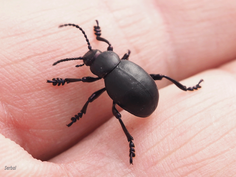 Color negro opaco, a veces con reflejos metálicos, cuerpo compacto y muy curvado, antenas con 11 artejos; las patas terminan en pinza y los metatarsos están recubiertos de unas almohadillas de color amarillo y rosado, las tibias traseras de las hembras son rectas. Tiene un punteado discreto sobre los élitros y más fino sobre el pronoto.