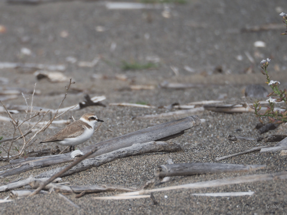 Chorlitejo típico pero de color arenoso y sin banda pectoral, las patas son negras lo que lo diferencia de las otras dos especies parecidas ( Chorlitejo Grande y Chico) que las tienen rosadas.