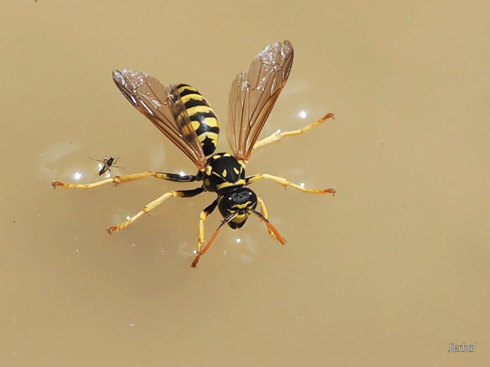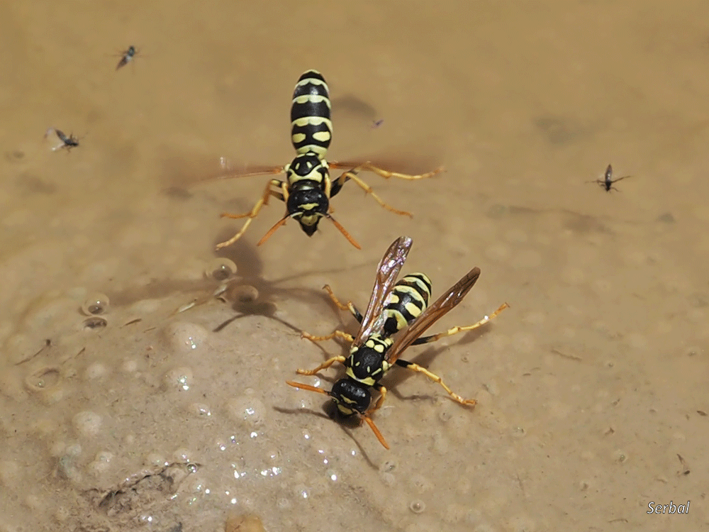 Esta avispa anida en los aleros de mi tejado, y bajo las tejas, muy frecuente, también bebe en las piscinas o sobre charcas o estanques.