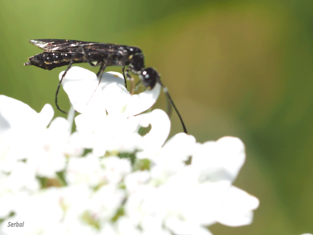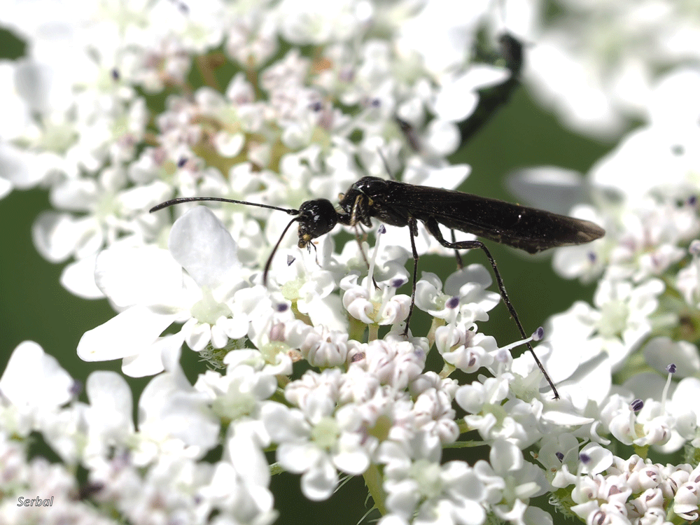 10-12 mm Pequeña avispa de color negro de la familia Cephidae; delgada y larga. Se distribuye por toda el área mediterránea, islas y Norteamérica.