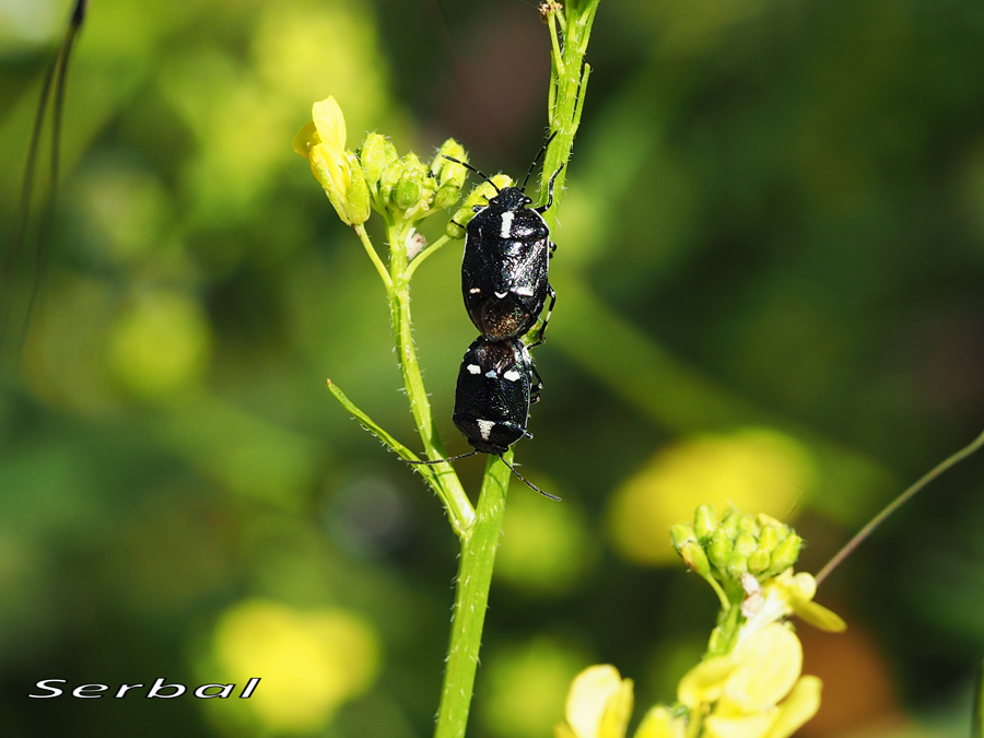 5-7 mm. Chinche de la familia Pentatomidae que se distribuye por todo el Paleártico; en la península Ibérica es bastante común y puede llegar a ser una plaga de las plantas Crucíferas como la col, nabo, etc.