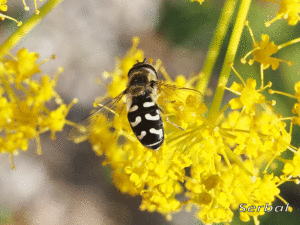 6-11 mm. Mosca de la familia Syrphidae que se distribuye por Europa, Asia y norte de África; bastante común en la Península Ibérica; a partir de su uso para el control de pulgones se ha expandido a otras partes del mundo.