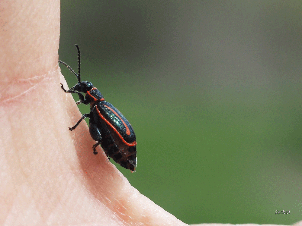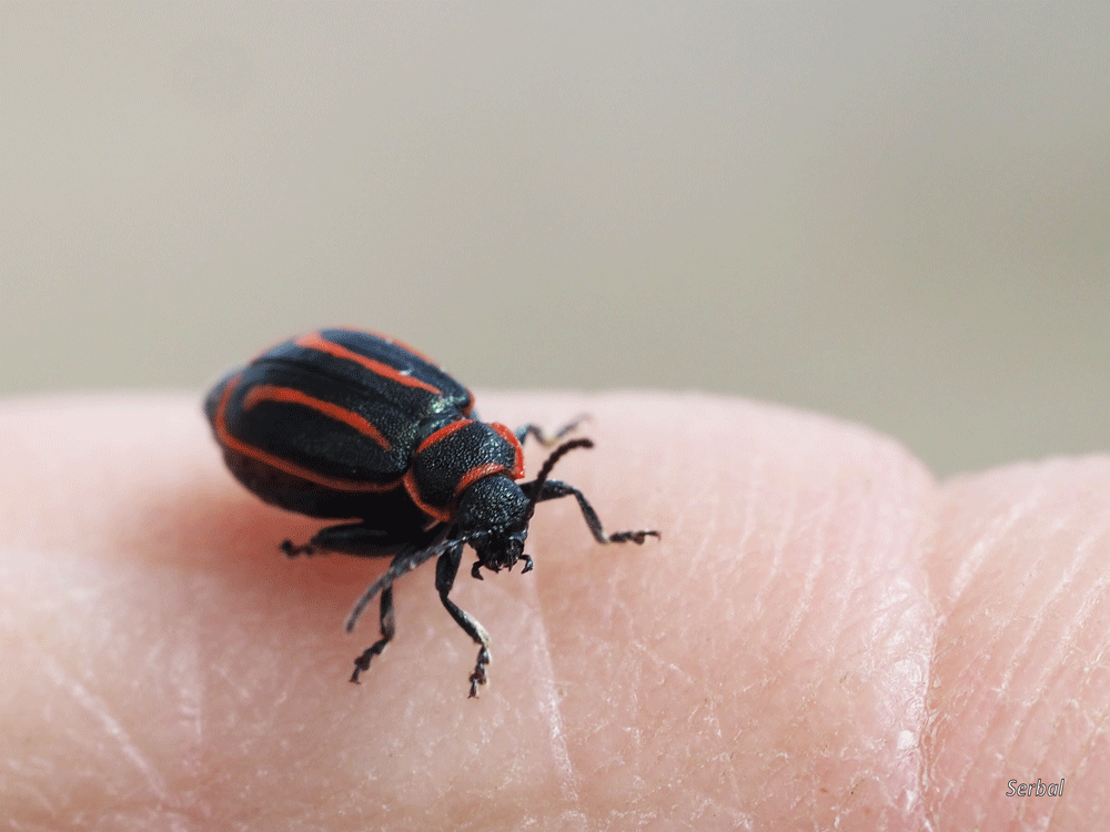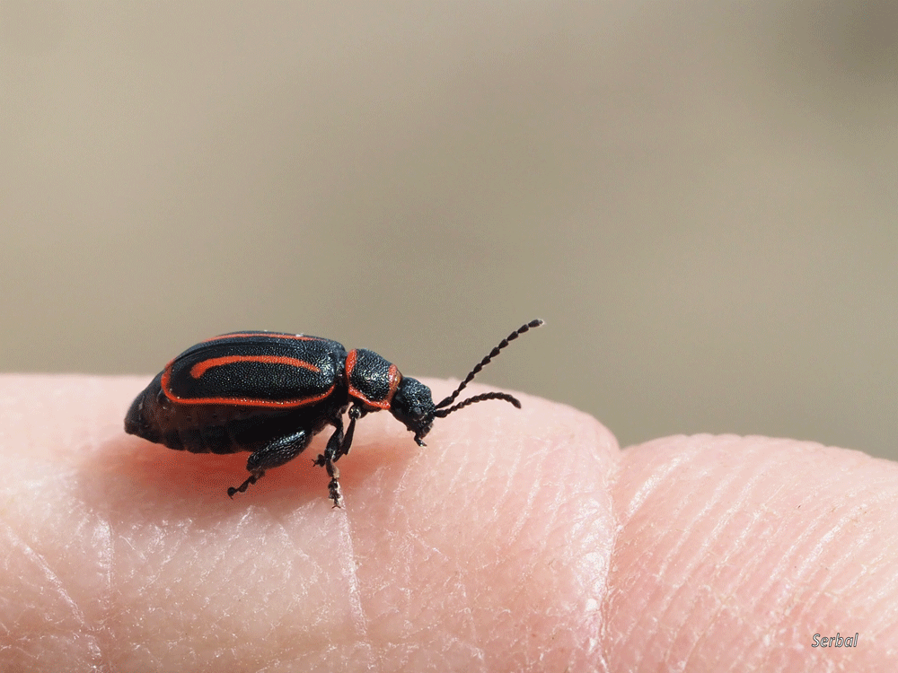 5 mm. Pequeño escarabajo de la familia Chrysomelidae; se distribuye por el norte de África y sur de la Península Ibérica, concretamente he podido comprobar que hay registros en las provincias de Málaga, Cádiz, Córdoba,  Granada y Sevilla, en este caso está fotografiado en la Serranía de Ronda (Málaga).