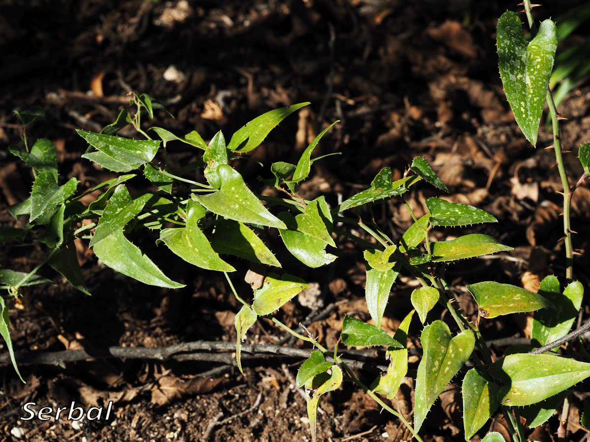 100-140 cm, trepando puede llegar a los 15 m. Planta trepadora de la familia Smilacaceae; se distribuye por todos los países ribereños del Mediterráneo, llegando por Oriente Medio hasta la India; en la Península Ibérica es bastante común asociada a otras plantas espinosas. Vive hasta los 1500 msnm.