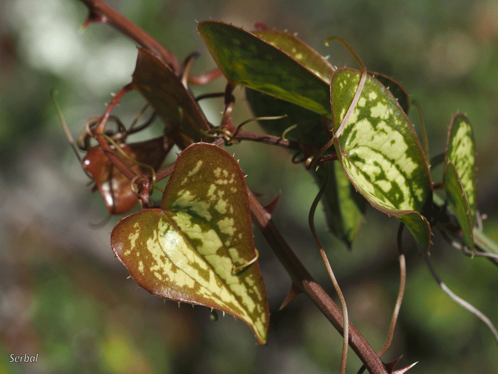 Las hojas tienen una base con forma de corazón, luego adquieren formas más o menos alargada, tienen espinas en el borde de la hoja, el color es verde oscuro, son perennes, alternas y coriáceas, no tiene vello, tienen pecíolo que en su base tiene dos zarcillos que le ayudan a trepar y fijarse. Los brotes son comestibles.