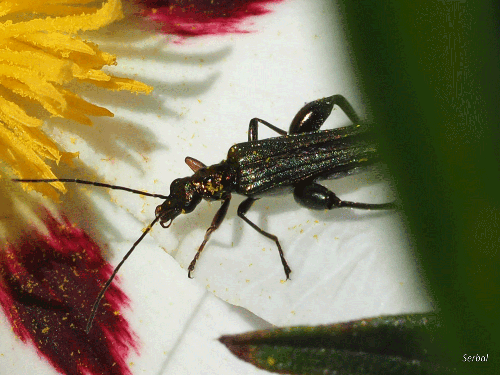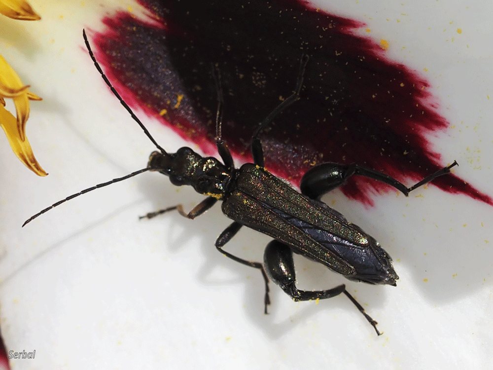 13 mm. Pequeño insecto de la familia Oedemeridae; se distribuye por la Europa occidental y mediterránea hasta Oriente Medio; bastante común en la Península Ibérica con la excepción del sur, donde es escasa.