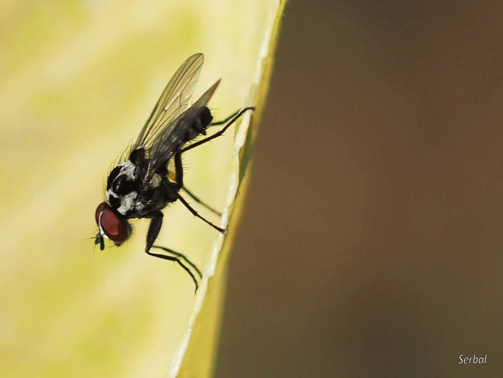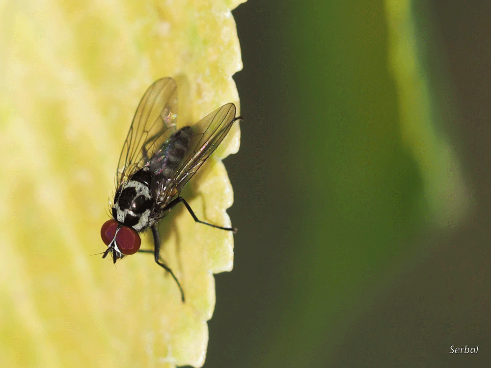 6 mm. Pequeña mosca darmata de la familia Anthomyiidae; se distribuye por los países ribereños del Mediterráneo; frecuente en la Península Ibérica, sobre todo en el este peninsular.