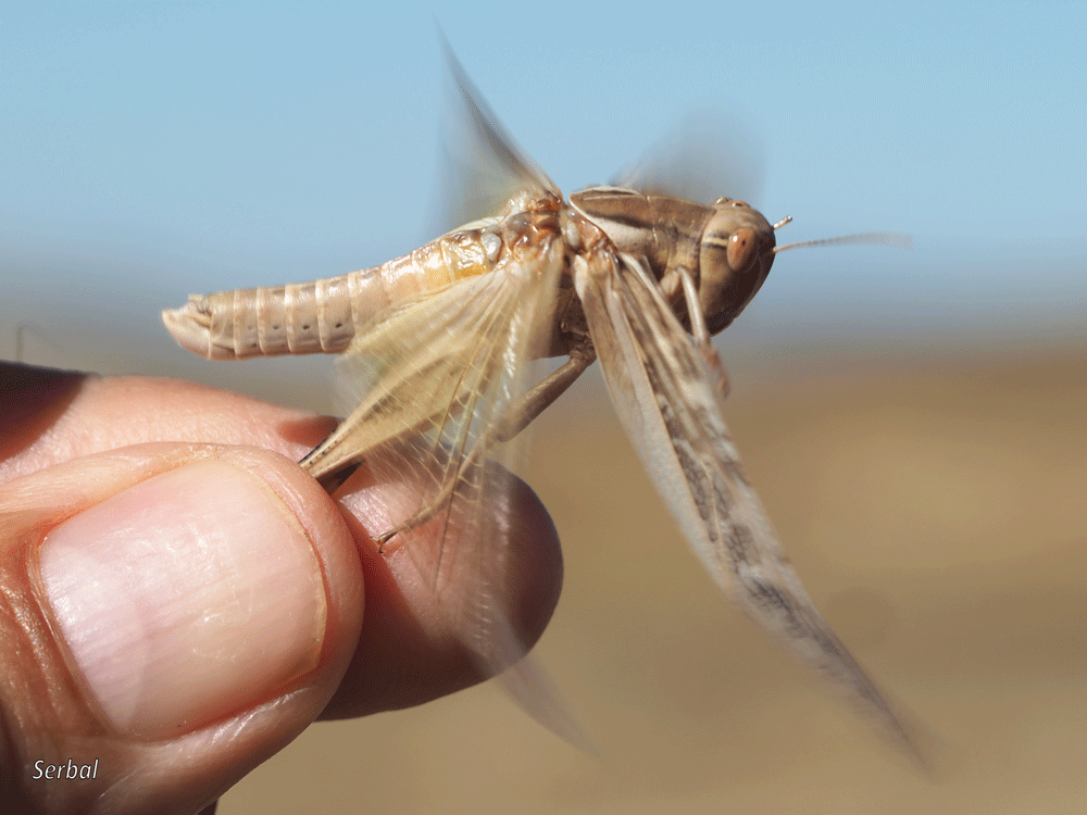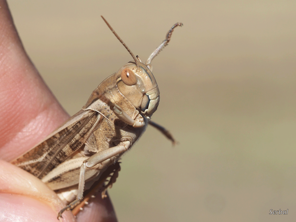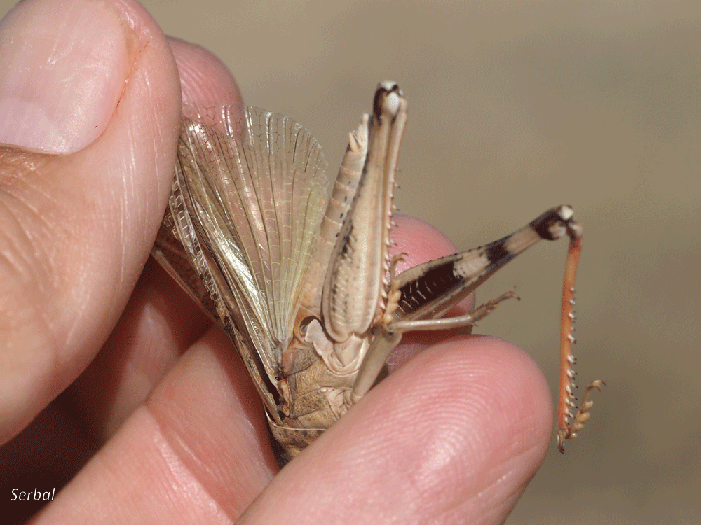 40-60 mm. Saltamontes de tamaño medio-grande de la familia Acrididae; se distribuye por Europa, Asia, África y Australia; frecuente en la Península Ibérica, de las distintas subespecies que hay, la subespecie “cinerascens” es la que corresponde a la Península Ibérica.