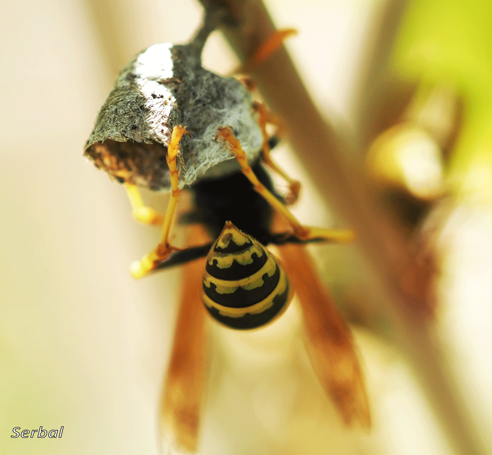 20 mm. Avispa de la familia Vespidae; se distribuye por la mayor parte de Europa, Oriente Medio y zona centro de Asia, recientemente también ha sido introducida en zonas de América del norte y sur; muy frecuente en la Península Ibérica, posiblemente la avispa papelera más común.