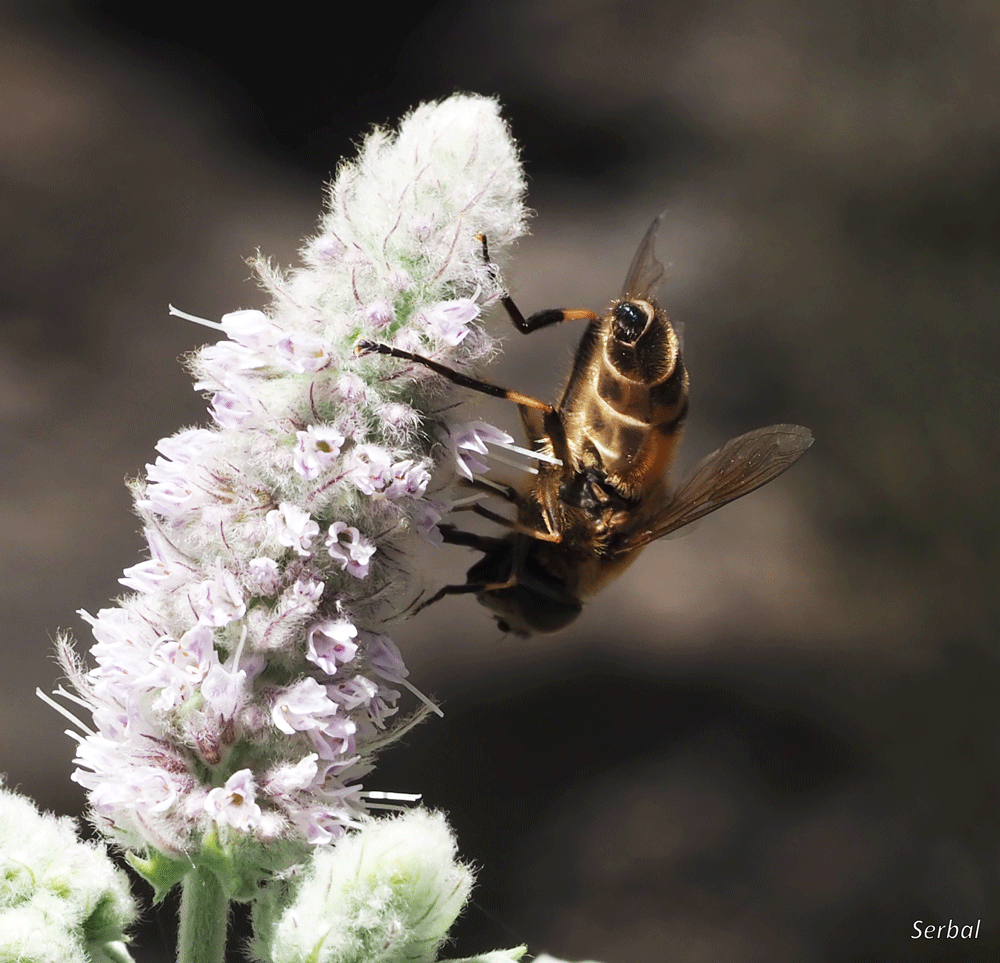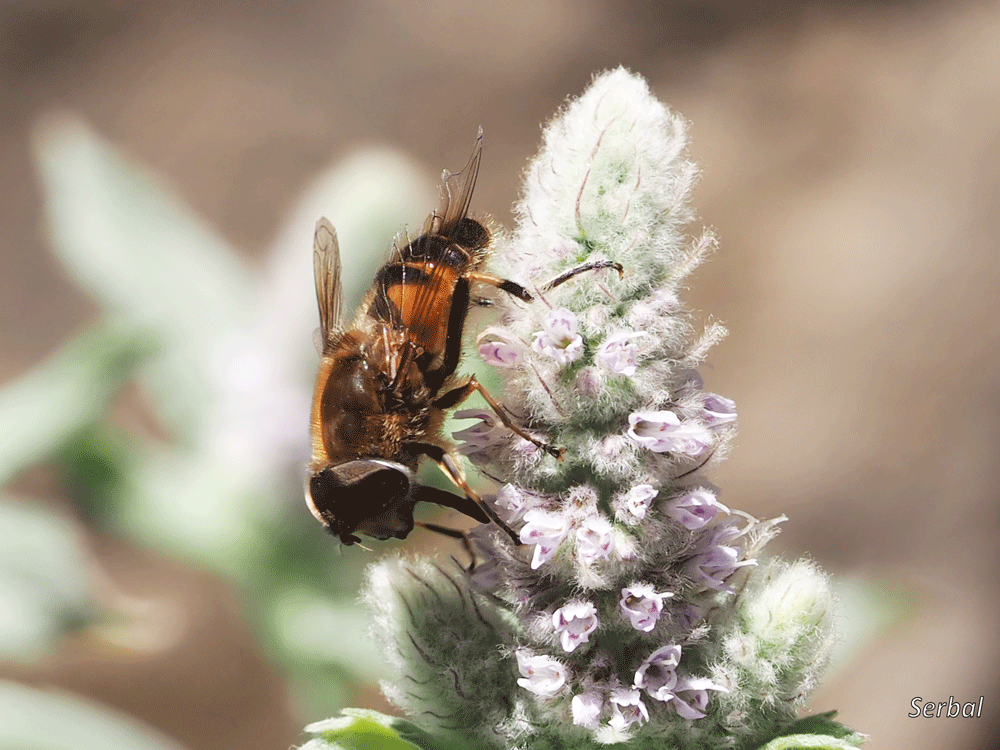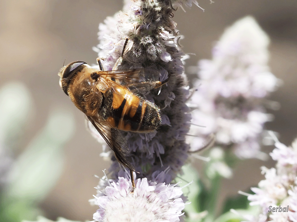 Vello anaranjado en el tórax y las patas, mitad superior de la tibia de color pálido, cara blanca con linea fina vertical central de color negro, alas hialinas con pterostigma de 4-6 veces más largo que ancho, amarillo en las hembras y gris claro en los machos con borde oscuro, los machos tienen el abdomen cuadrado y bastante oscuro, las hembras son muy parecidas a Eristalis pertinax.