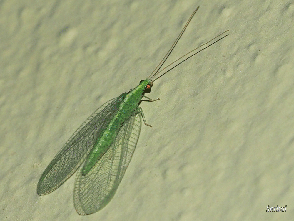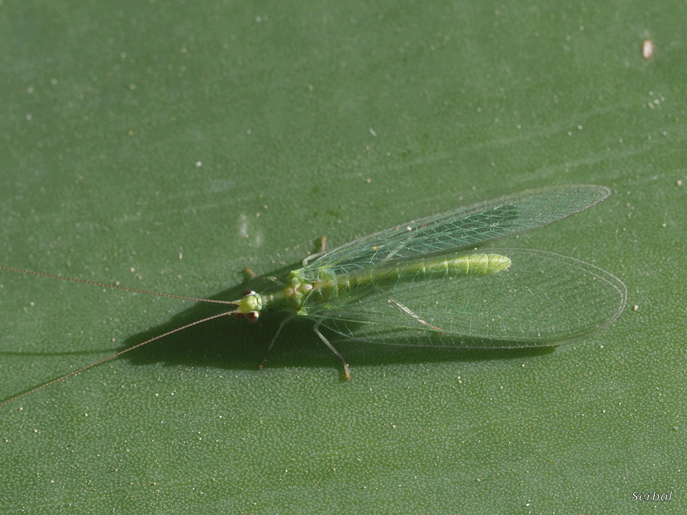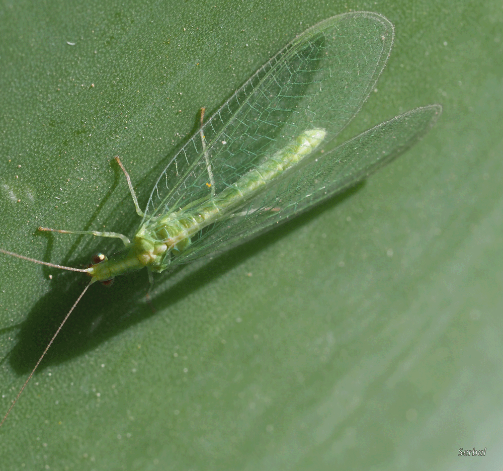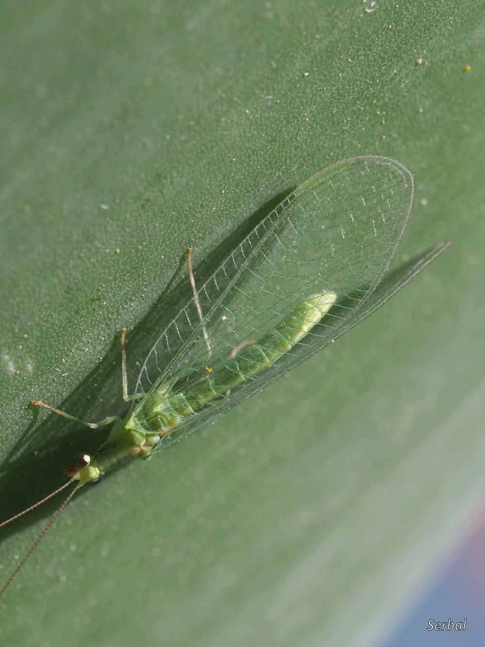 Es un insecto de color verde, la especie Chrysoperla mediterranea tiene una línea amarilla sobre el dorso que lo recorre longitudinalmente, alas grandes y ovoides, nervadas, resto del cuerpo verde, antenas largas y filiformes, aparato masticador con manchas rojas.