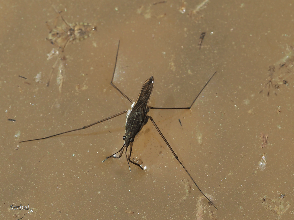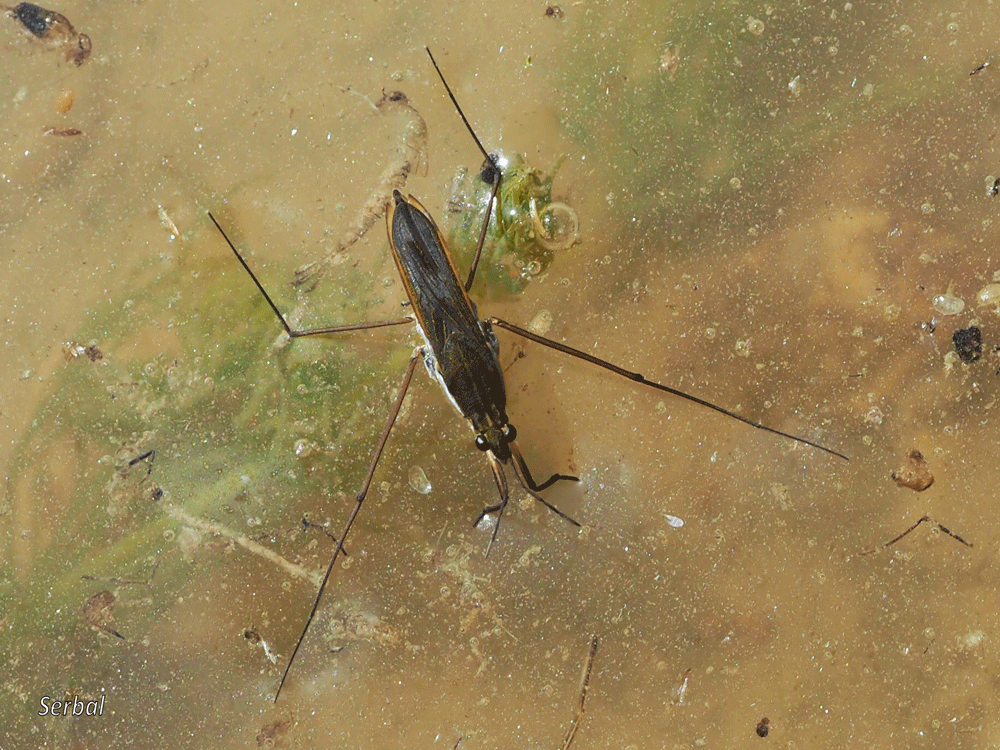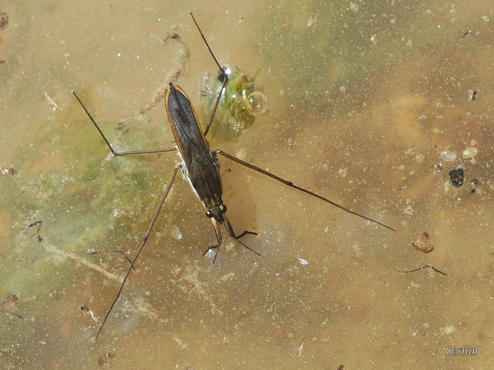 10 mm de longitud corporal, 20-30 mm con las patas y antenas. Zapatero de la familia Gerridae; se distribuye por la mayor parte de Europa incluyendo la península Ibérica, aunque su mayor presencia está en la mitad norte. Hay 11 especies de este género en la península Ibérica.