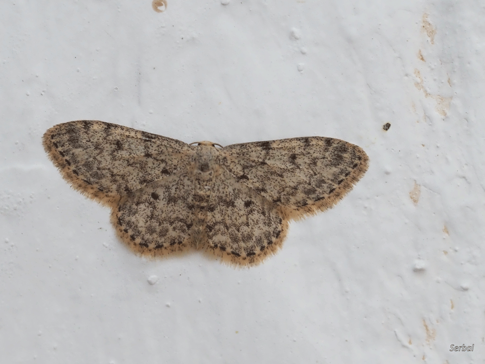 Forma de geometra, con las alas anteriores terminadas en borde agudo y las posteriores con forma amplia y redondeada; color de fondo gris, este gris puede ser más oscuro, claro o con tonalidad ocre; sobre las alas se dibujan dos líneas irregulares, una proximal y otra distal en dorso alar, un punto oscuro en cada ala, línea oscura subterminal formada por pequeños trazos negros, a diferencia de otras Idaea, que solo tienen una línea de puntos subterminal; fimbrias largas de tono ocre.