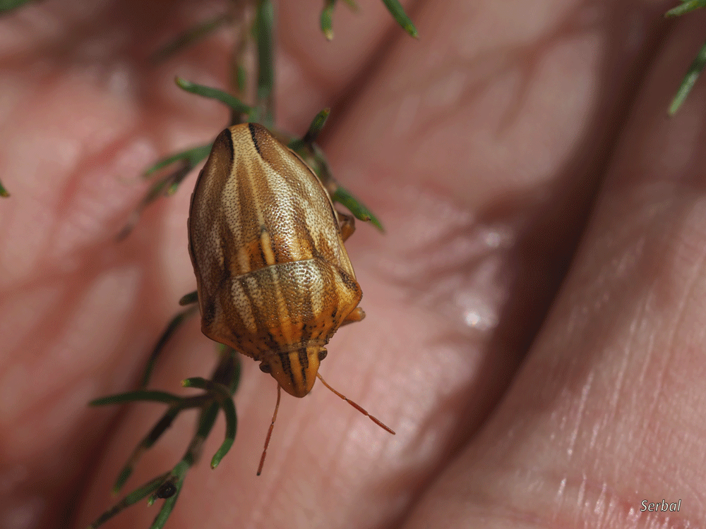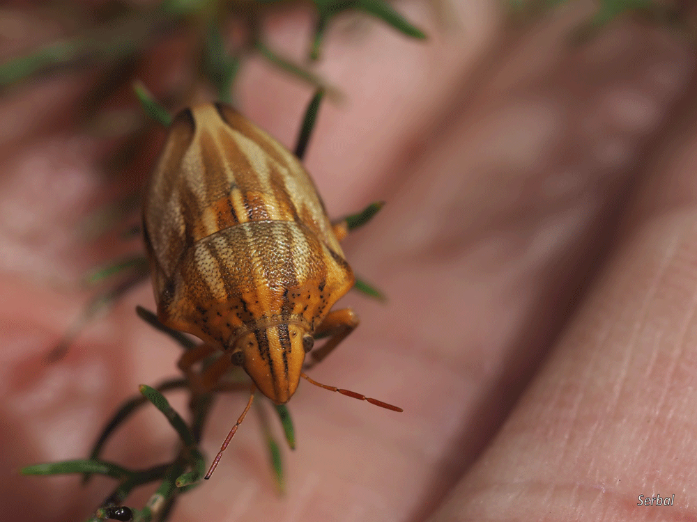 8-11 mm. Chinche de la familia Scutelleridae; se distribuye por Europa y Asia central y sobretodo por la Europa mediterránea; habitual en zonas cálidas de la Península Ibérica.