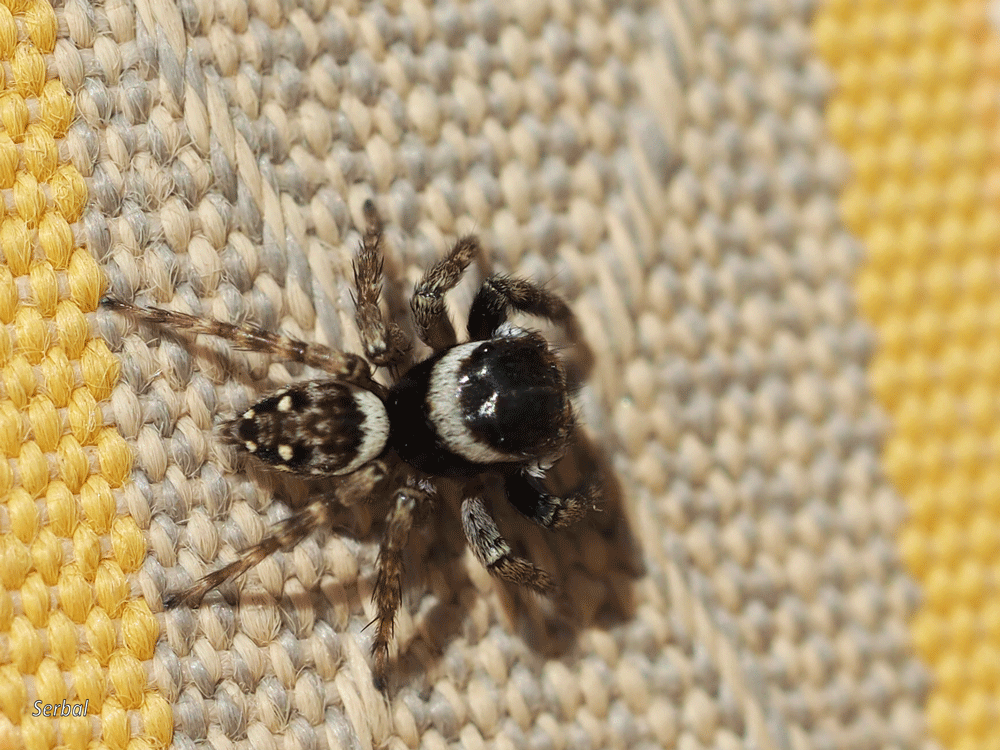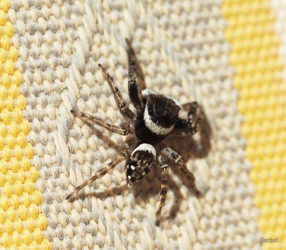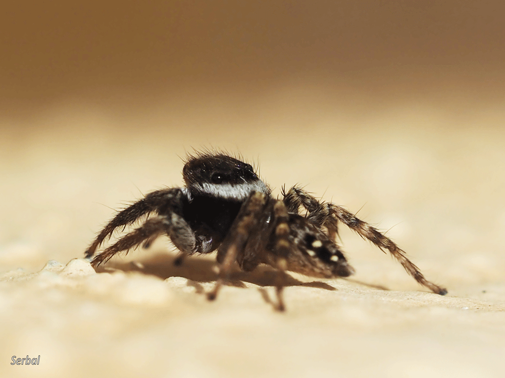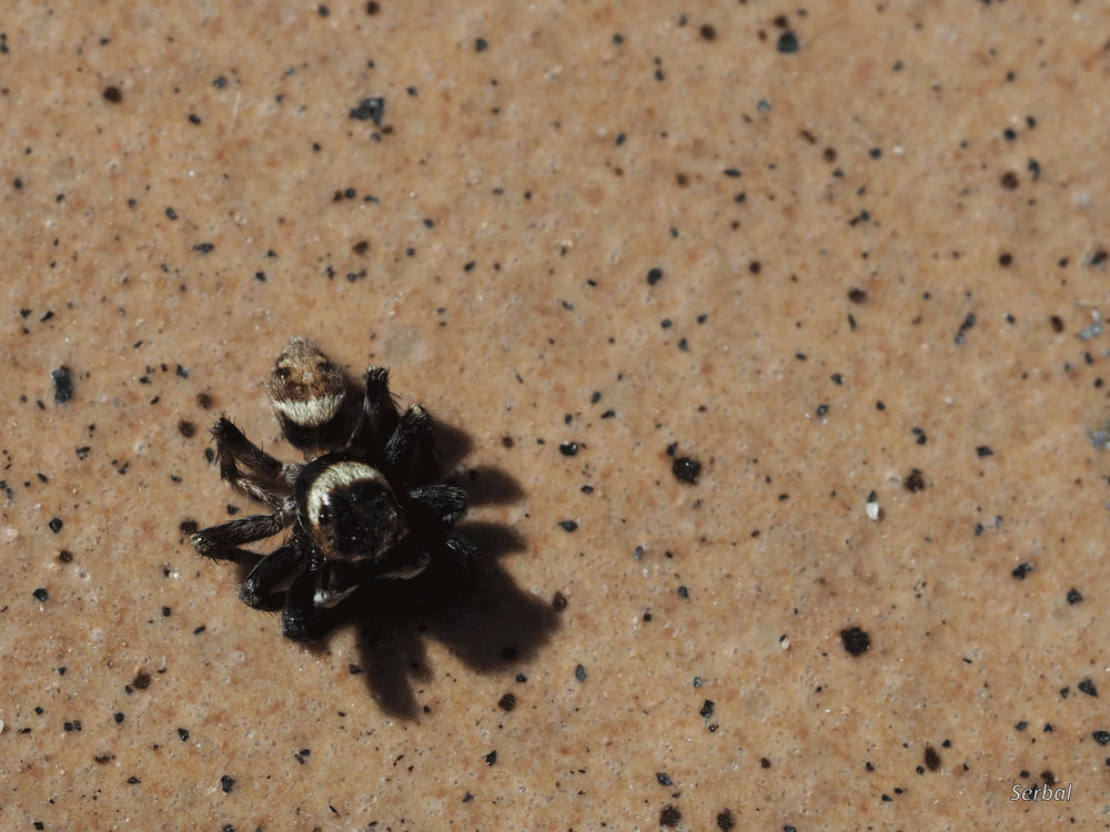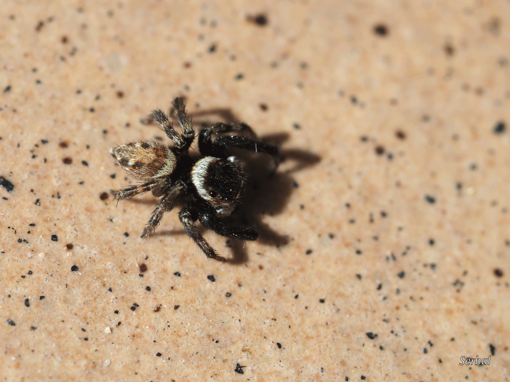 4-6 mm los machos y 6-8 mm las hembras. Pequeña araña de la familia Salticidae; es de origen africano, aunque actualmente se encuentra distribuida por las zonas templadas de la mayor parte del mundo; frecuente en las áreas cálidas de la Península Ibérica.