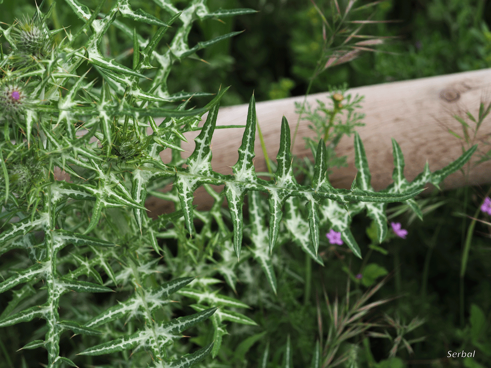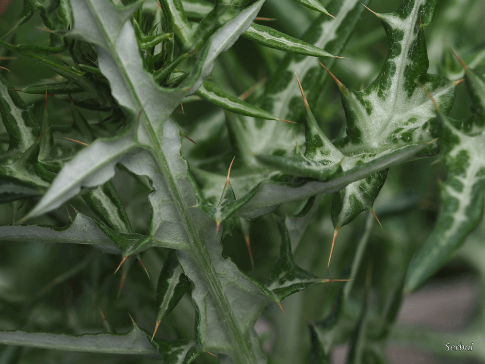 La planta surje tras las lluvias otoñales, al principio es una roseta de hojas oblongolanceoladas y pediceladas, avanzado el invierno empieza a desarrollarse el tallo, las hojas de éste son sésiles y alargadas hasta los 18 cm, tienen múltiples lobulos alargados y estrechos (pinnatisectas), son alternas, tienen el haz de color variegado, es decir, con áreas verdes y otras blancas, coincidiendo con las zonas nervadas, el envés está cubierto de fino vello tomentoso, las hojas tienen espinas en los ápices de los lóbulos y en los salientes del contorno foliar, son amarillentas y de hasta 15 mm de larga, punzantes; las hojas superiores son más pequeñas y estrechas; el tallo es también tomentoso.