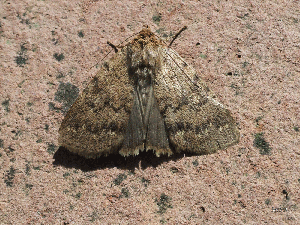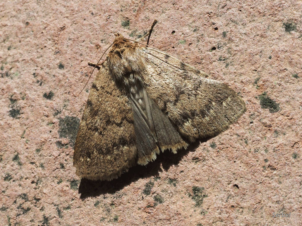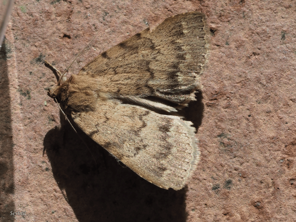 Mariposa de color ocre, destacan tres franjas oscuras transversales e irregulares, las dos más lejanos próximas entre si, en zona de tórax se insinúa otra franja transversa interrumpida en zona central, en el tercio distal del dorso hay una línea transversa marcada de oscuro proximalmente y claro distalmente algo menos irregular y más recta; sobre la celda un punto claro seguido de mancha reniforme de contorno claro; punteado alargado subterminal; las alas posteriores son de color uniforme pálido grisáceo.