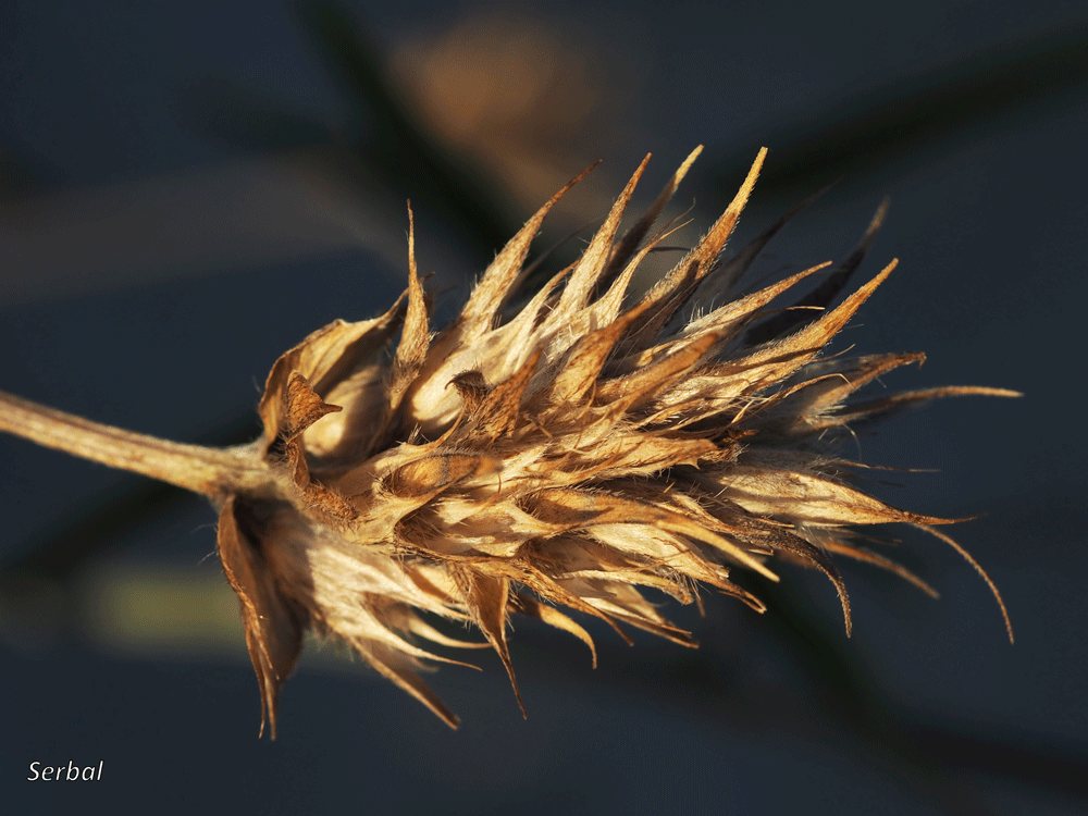 El fruto es una legumbre con pico curvado y amenazador, en su superficie tiene abundante vello y setas negras; la semilla mide 3-4 mm.