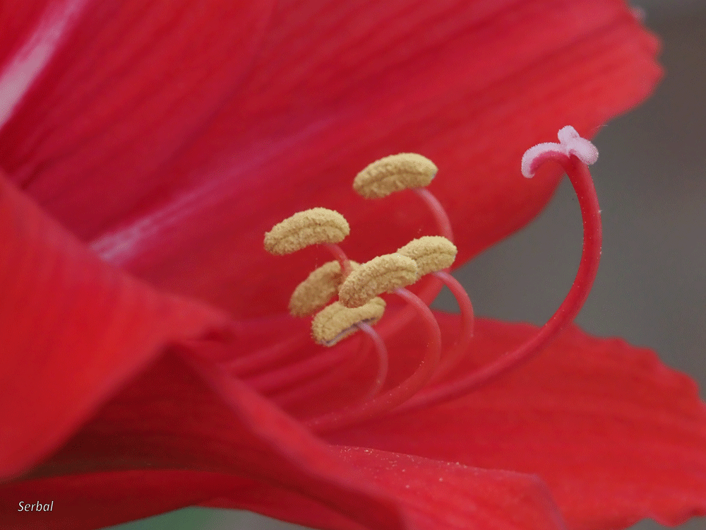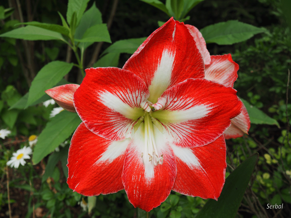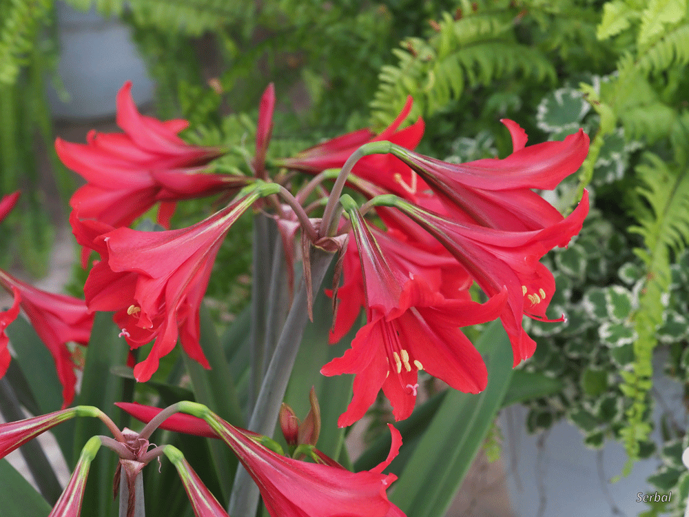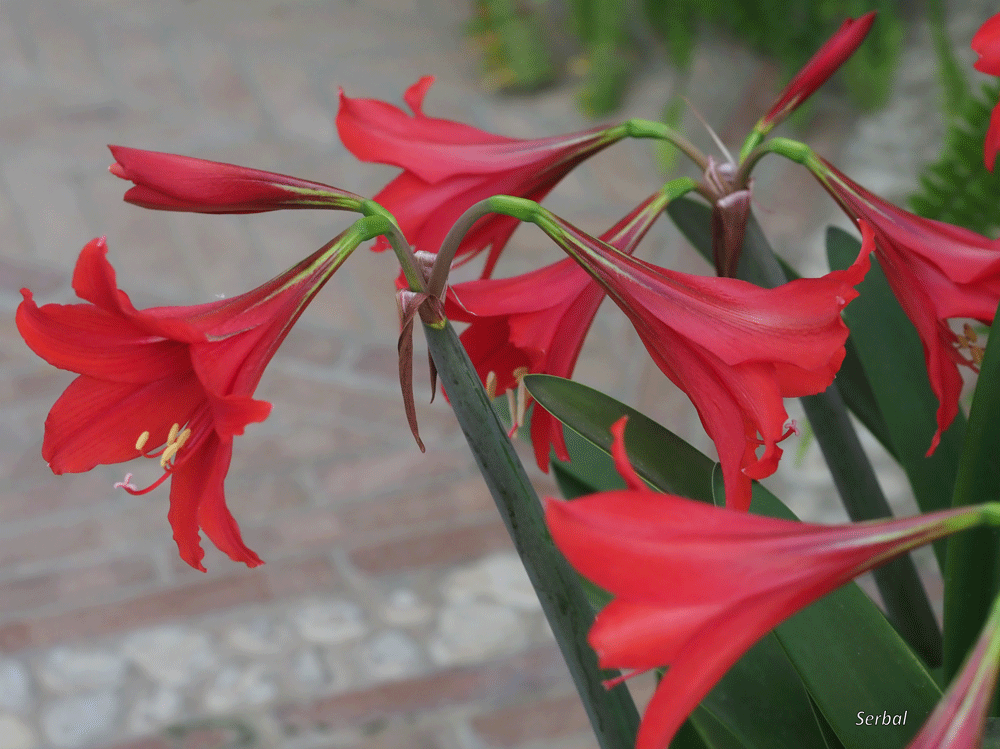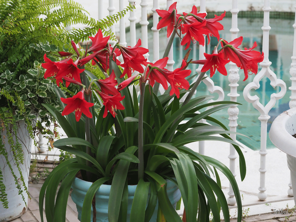 Del centro de las hojas basales sale un largo tallo llamado escapo que termina en una umbela con un número de flores que puede oscilar entre 2 y 4, de disposición opuesta (suegra y nuera), estas son grandes, de hasta 20 cm de diámetro, con 6 tépalos que forman una gran campana, dentro 6 estambres y un estigma trífido, el color de los tépalos puede ser rojo, rosado o blanco, a veces combinando dos colores, ya que se han desarrollado muchos cultivares ornamentales; la flor aparece al final de la primavera y persiste durante 3-6 semanas; es muy espectacular y llamativa.