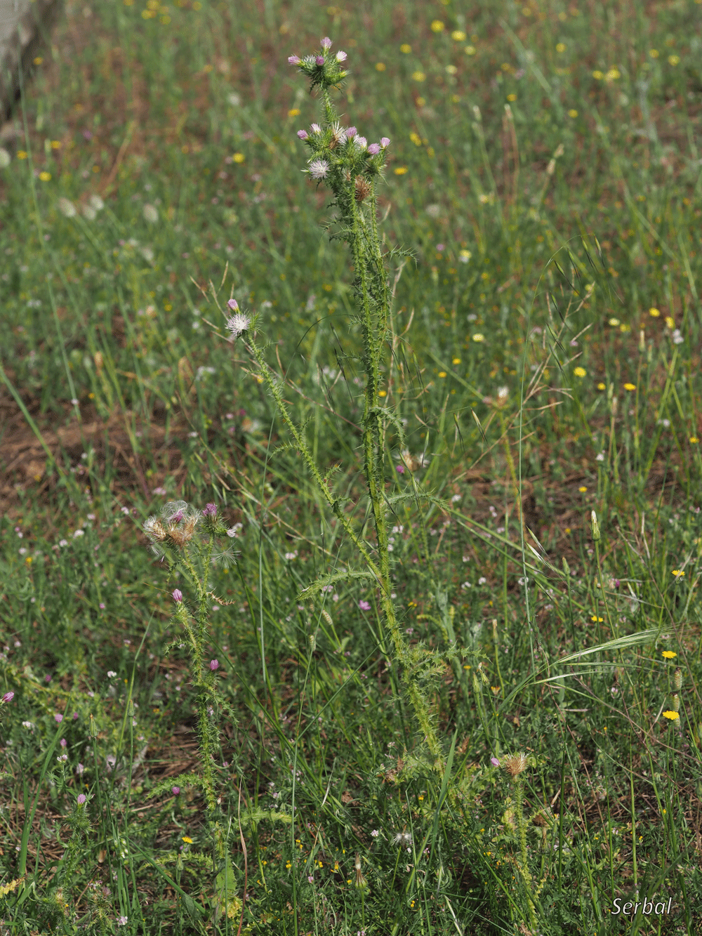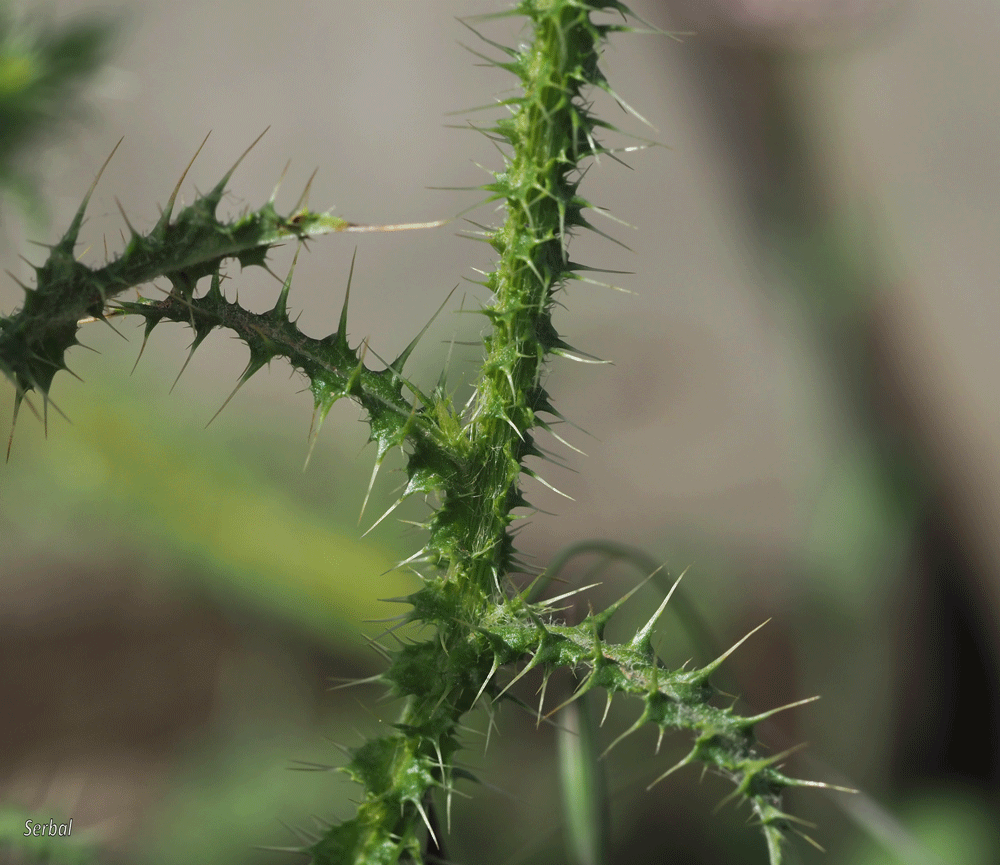 Planta anual o bienal, brota en otoño, tra slas lluvia sotoñales, bien de semillas o d el araíz del añao anterior, parte de una roseta basal con hojas alargadas, lanceoladas y formada por pares de foliolos acabados en espinas; el tallo suele ser erecto con alas en sus márgenes que forman triángulos y estos acaban en espina de hasta 15 mm de longitud, en su parte superior suelen dividirse.