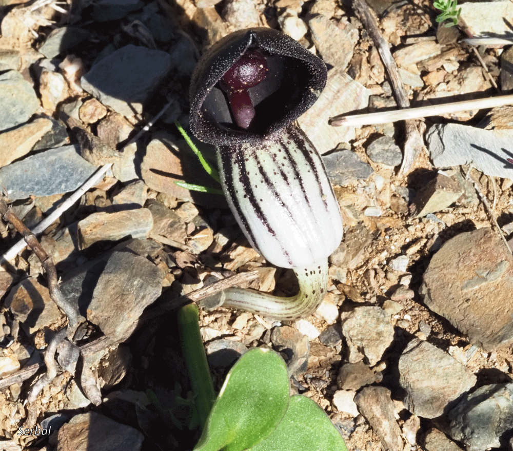 Esta discreta planta, pasa desapercibida, con sus manchas de hojas dispersas, pero llama la atención su gran flor de color violáceo y forma de campana ensanchada, si curioseamos dentro, veremos sus pequeñas flores.