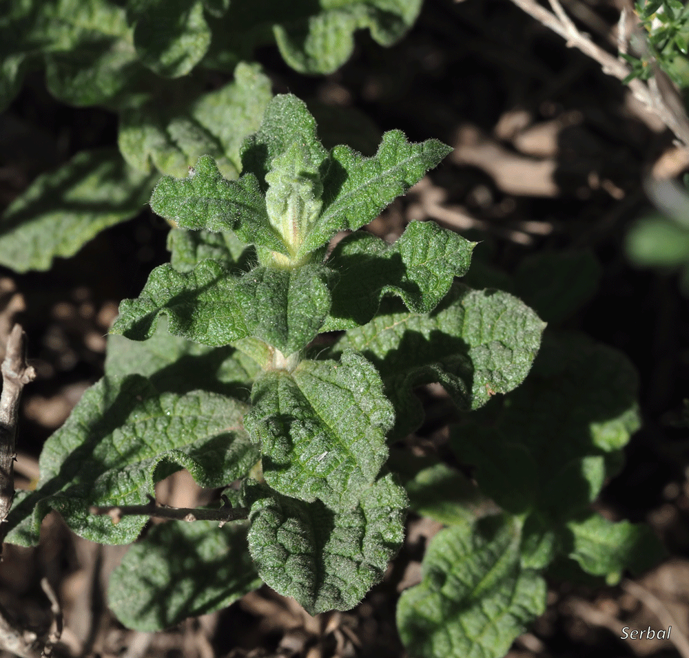 Las hojas miden 2-3 cm de longitud, sentadas, forma lanceolada y margen foliar rizado, verde por el haz y algo más blanco por el envés.