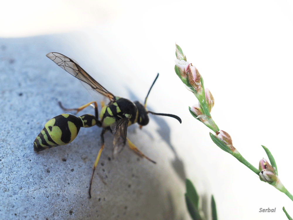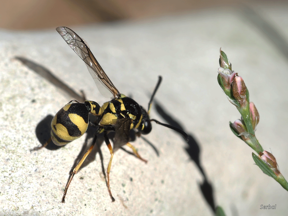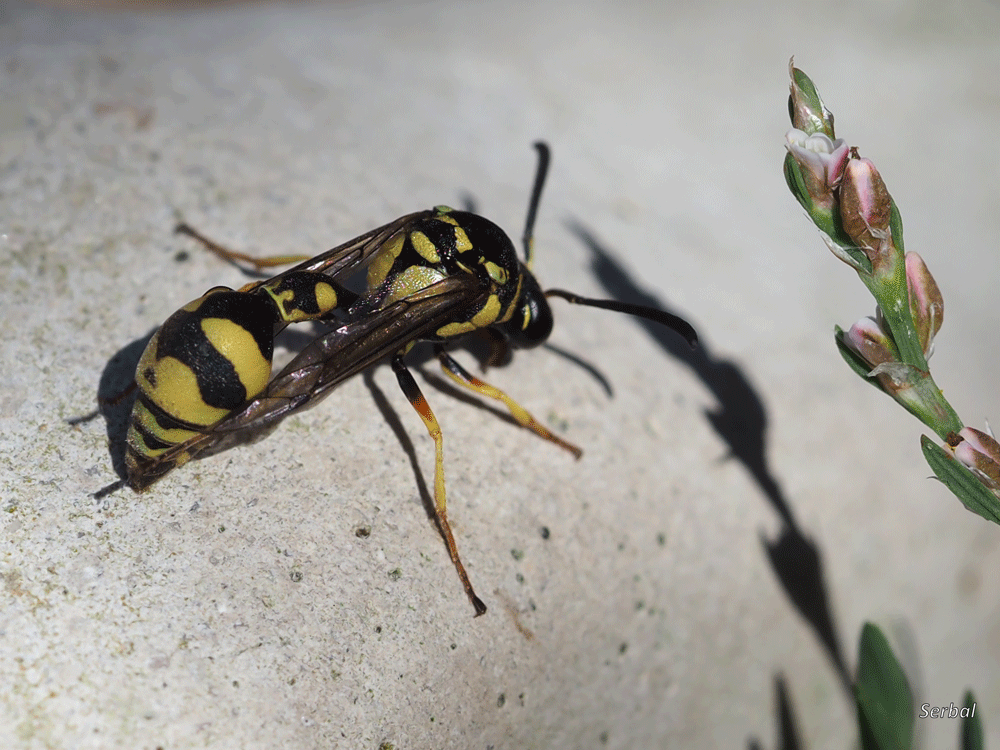 14 mm. Avispa de tamaño medio y cuerpo estilizado; pertenece a la familia Vespidae y subfamilia Eumeninae (antes familia propia); se distribuye ampliamente por el área mediterránea y Asía templada hasta China; presente en la Península Ibérica, más en área mediterránea.