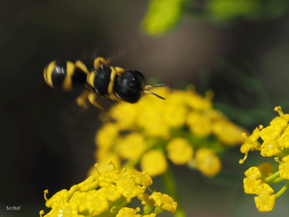 Pequeña avispa que se alimentaba de azúcares y melaza sobre una hoja de higuera, en finca familiar de la Serranía de Ronda.
