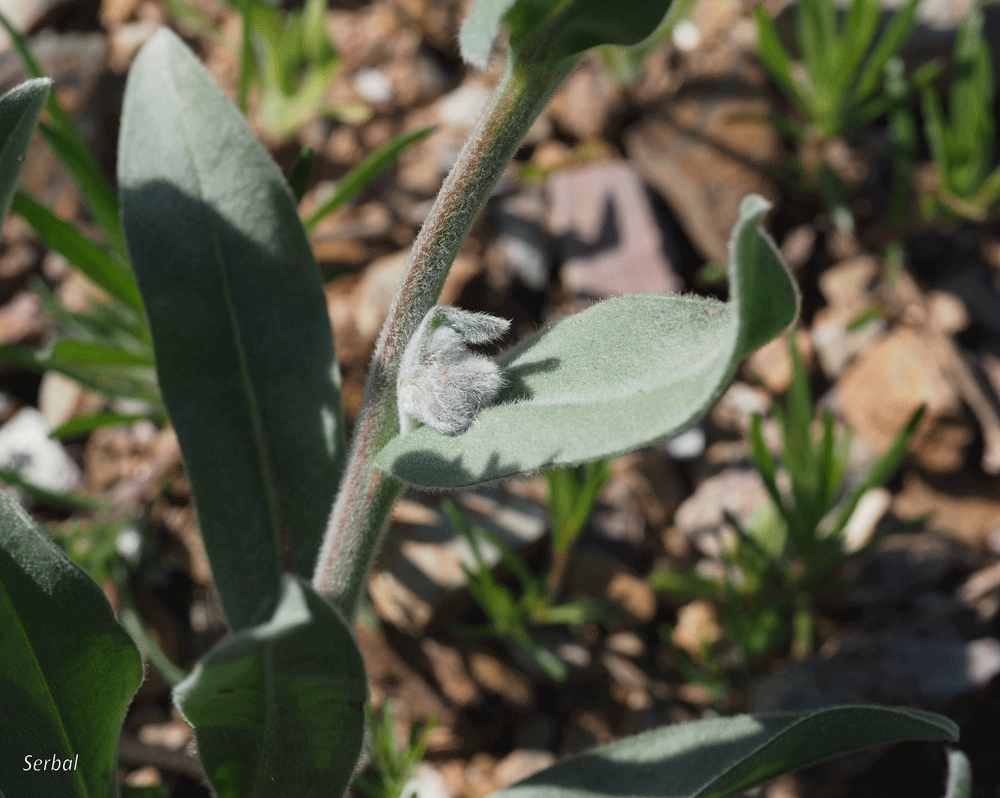 Planta cubierta en tallo y hojas de vello blanquecino corto que le dan un aspecto suave, puede tener un solo tallo o ramificarse desde la base.