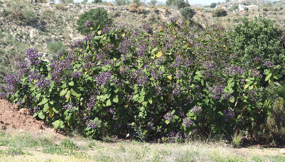 Esta planta ha sido introducida en algunos lugares cálidos del mediterráneo como ornamental, por sus grandes hojas y vistosos racimos de flores violetas.