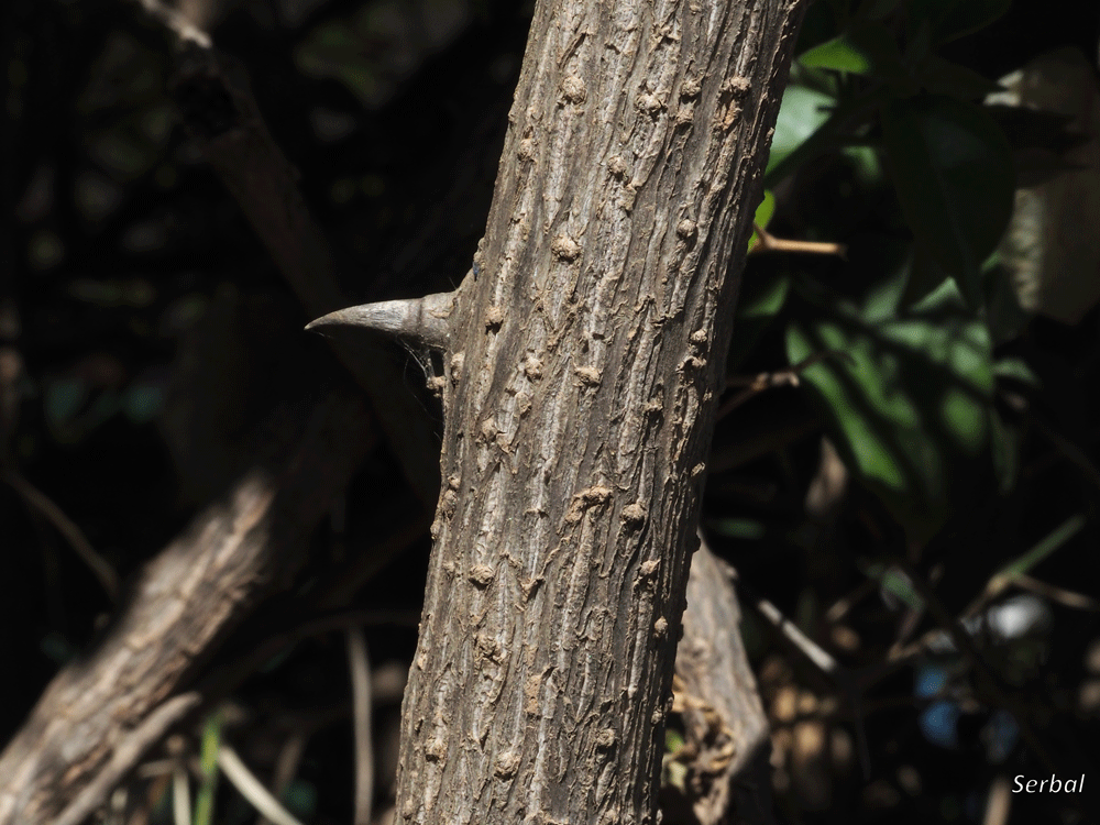 Planta trepadora de ramas largas, arqueadas y leñosas cuando envejecen, trepan apoyándose en las espinas que tienen en el tronco y en las axilas de las hojas; tienen un crecimiento rápido; color del tronco gris estriado; los tallos jóvenes y hojas nuevas tienen vello corto y blanquecino.