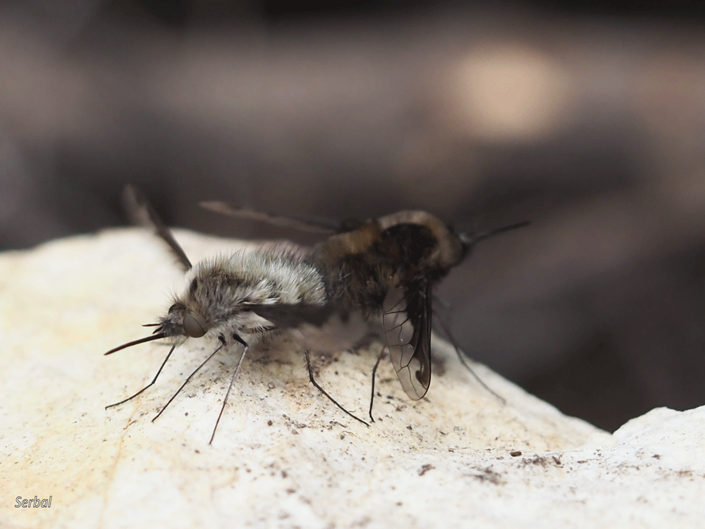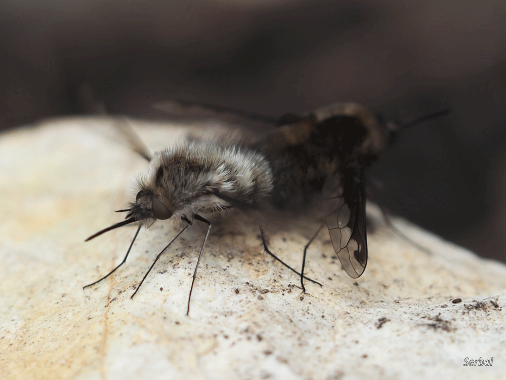 10-15 mm de longitud. Mosca de la familia Bombyliidae; se distribuye ampliamente por las zonas templadas de Eurasia y América del norte; común en las zonas templadas de la Península Ibérica.