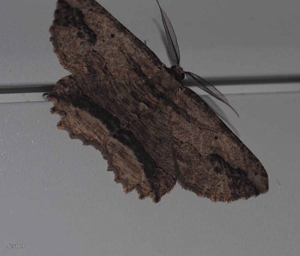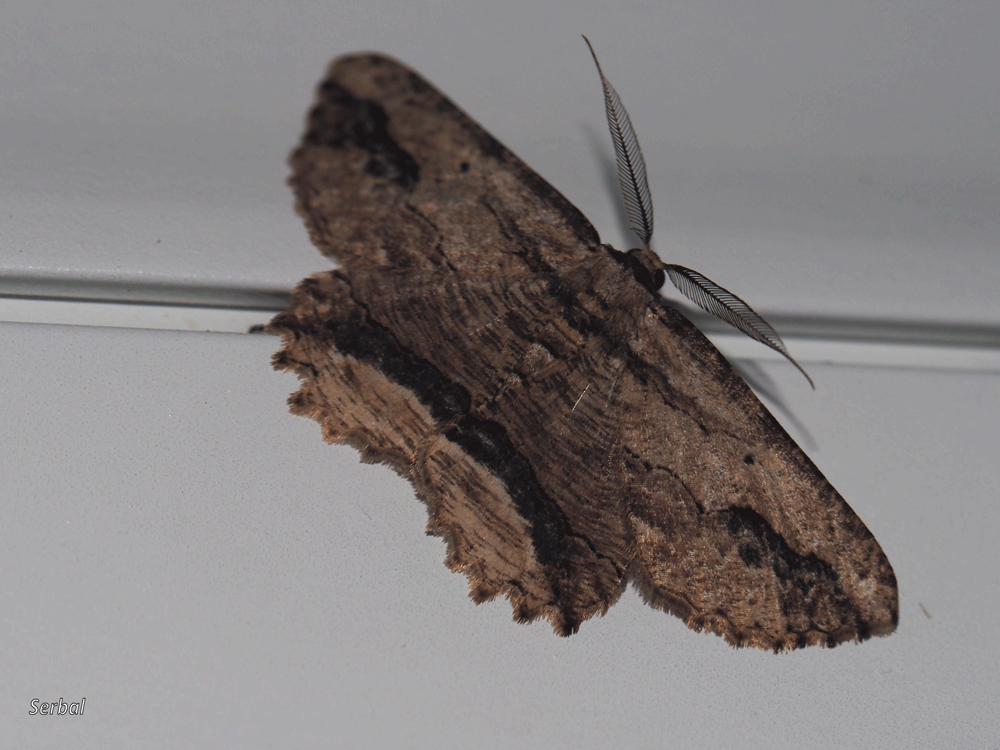 Tono de base pardo, desde tonos claros a tonos oscuros, destaca una franja en zona proximal central oscura, poco después de acabar esta franja aparecen un punto en cada celda, zona media con línea irregular transversal que cerca de la costa presenta una mancha oscura en su área posterior; alas posteriores con una franja oscura en forma de arco próxima a zona distal y acabado de las fimbrias con aspecto dentado; machos con antenas plumosas (pectinadas) y hembras con antenas filiformes.
