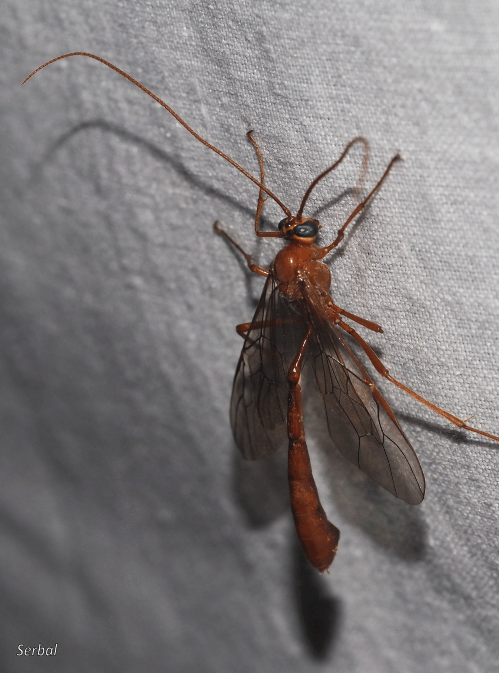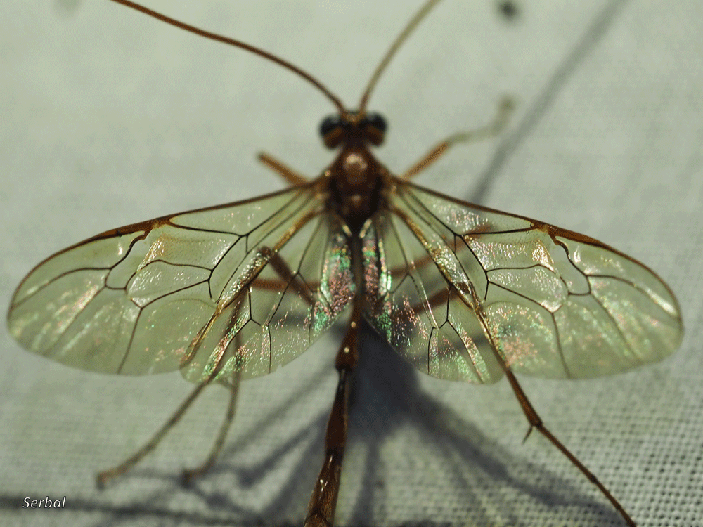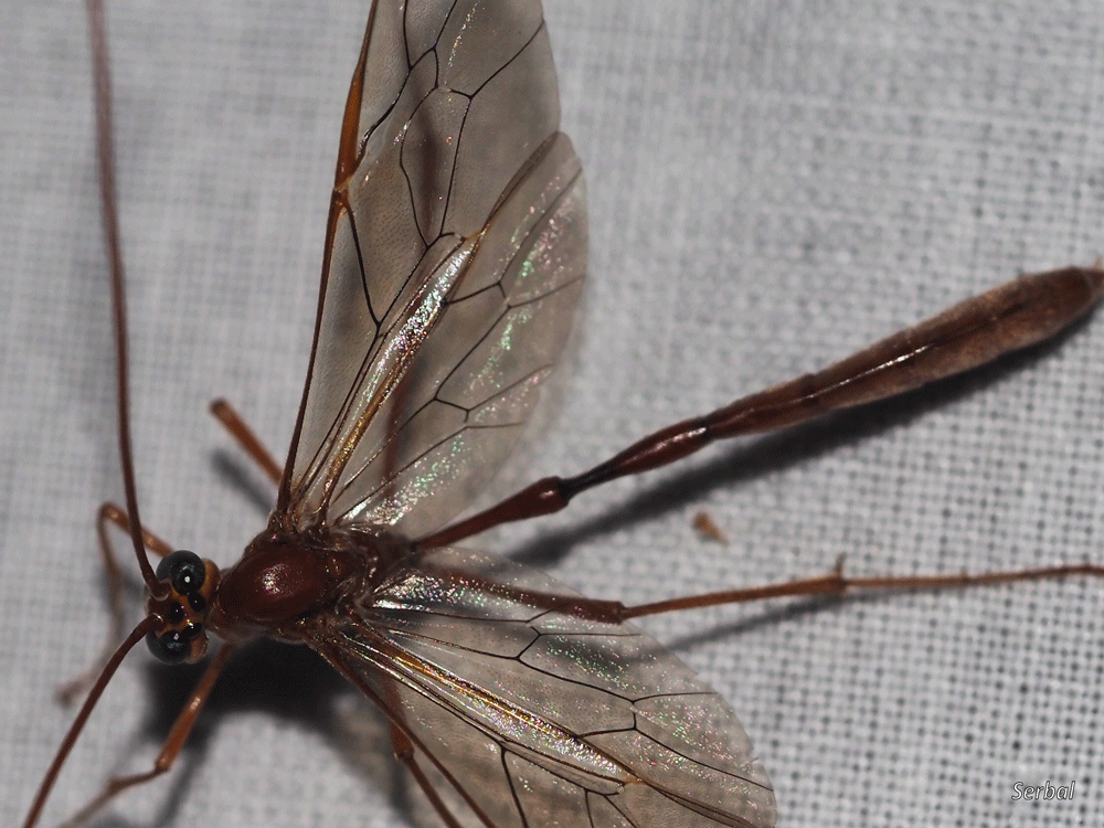 25-40 mm. Avispa de la familia Ichneumonidae; presente en sur y centro de Europa, penetra hacia el este hasta Asia central; frecuente en la Península Ibérica.