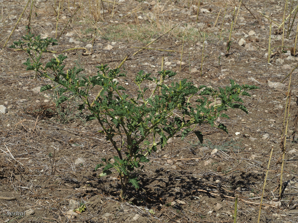 20-100 cm. Herbácea anual de la familia Solanaceae; es originaria de Sudamérica, desde ahí se ha extendido a buena parte del mundo de clima cálido, dispersa en la Península Ibérica.