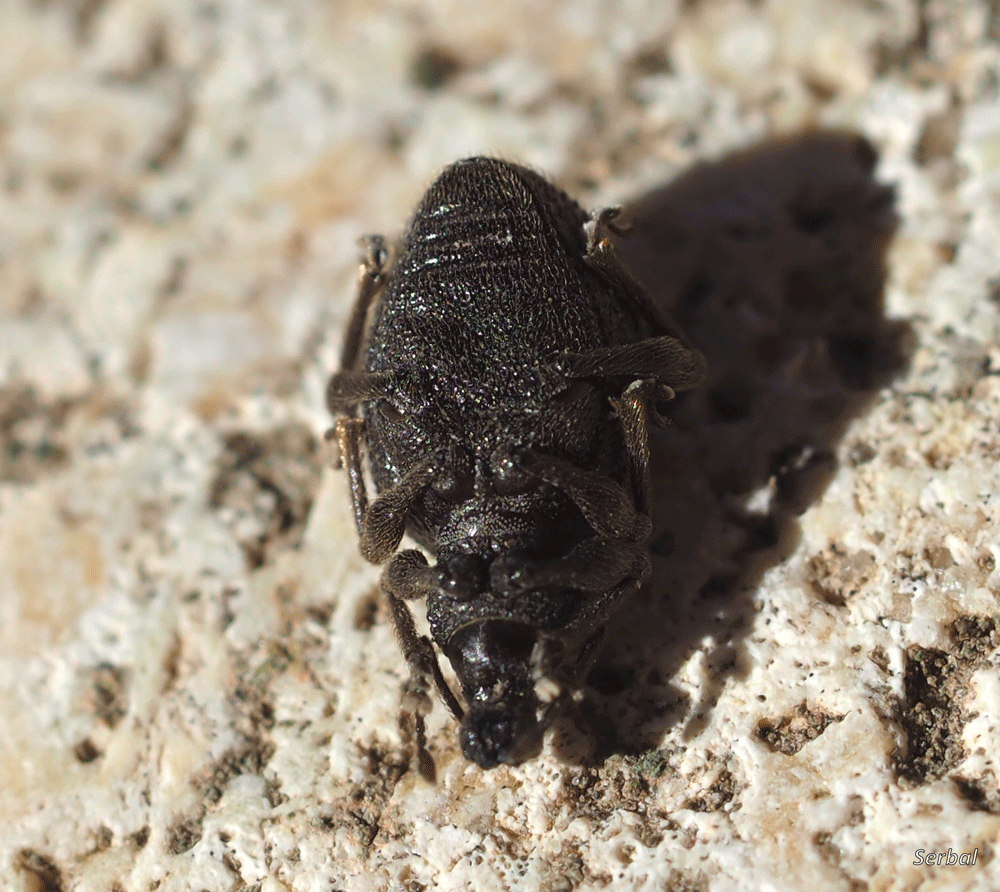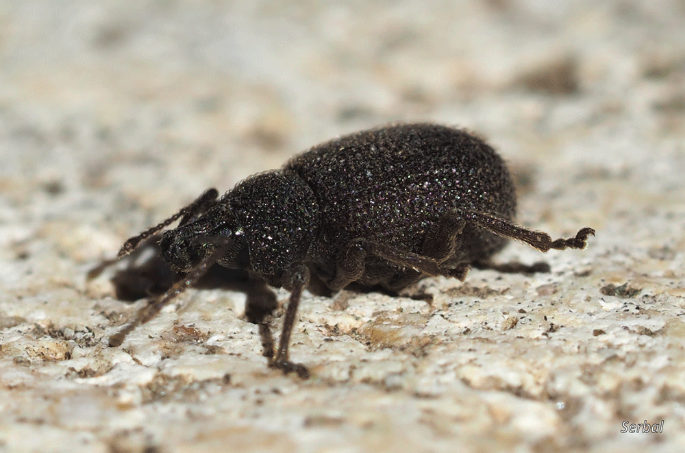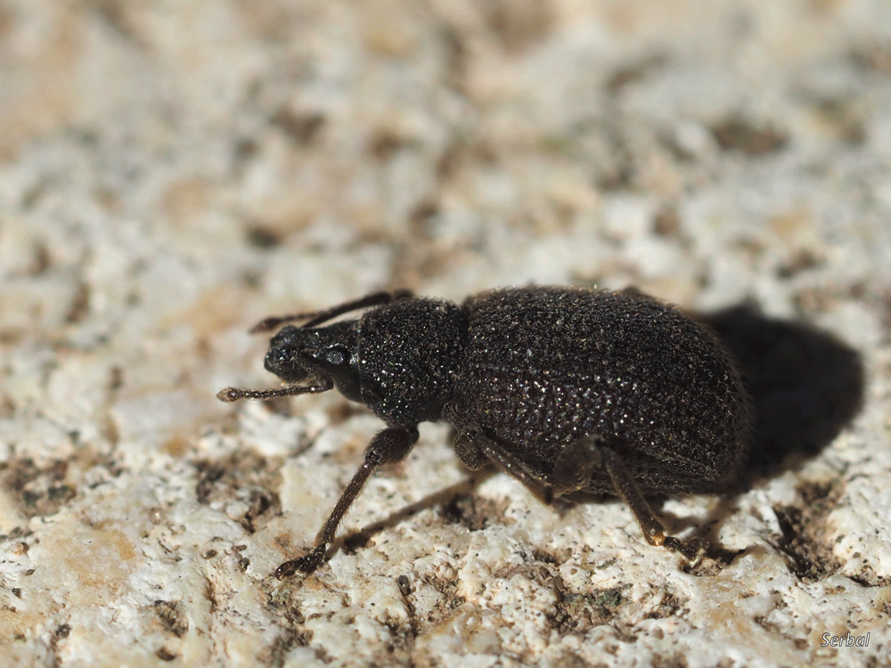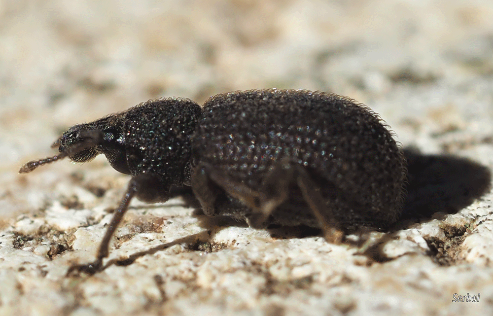 5-7 mm. Pequeño escarabajo gorgojo de la familia Curculionidae; es originario del Paleártico occidental, desde ahí se ha extendido a buena parte del mundo de clima templado y cálido; frecuente en la Península Ibérica.