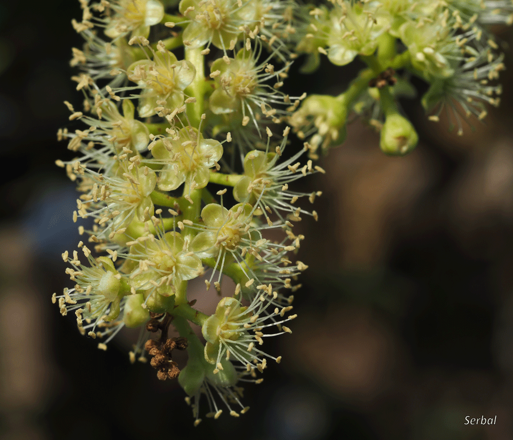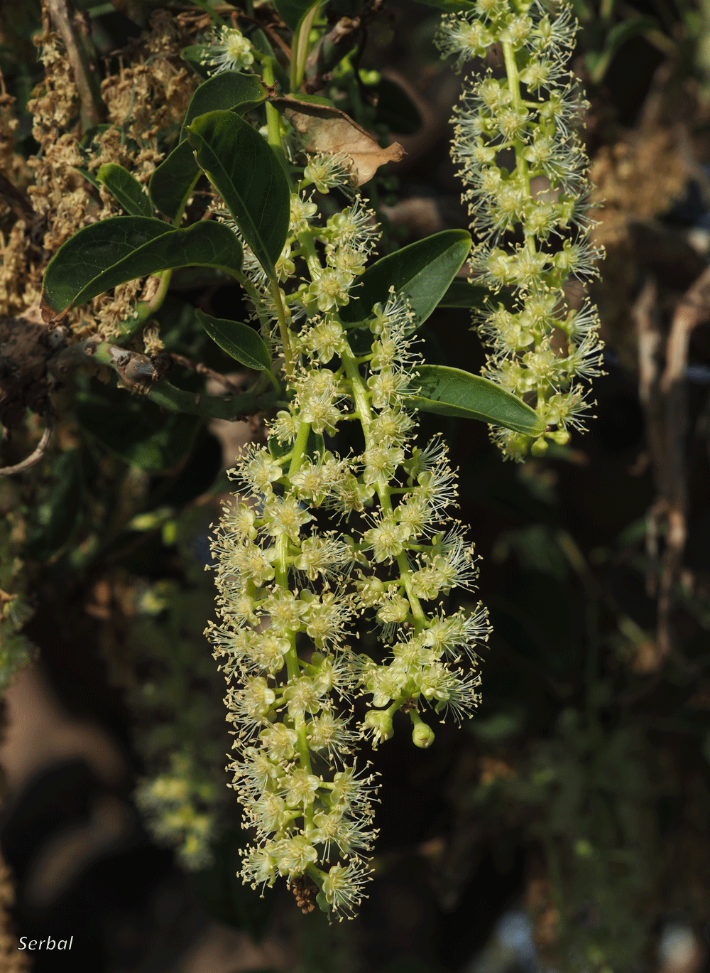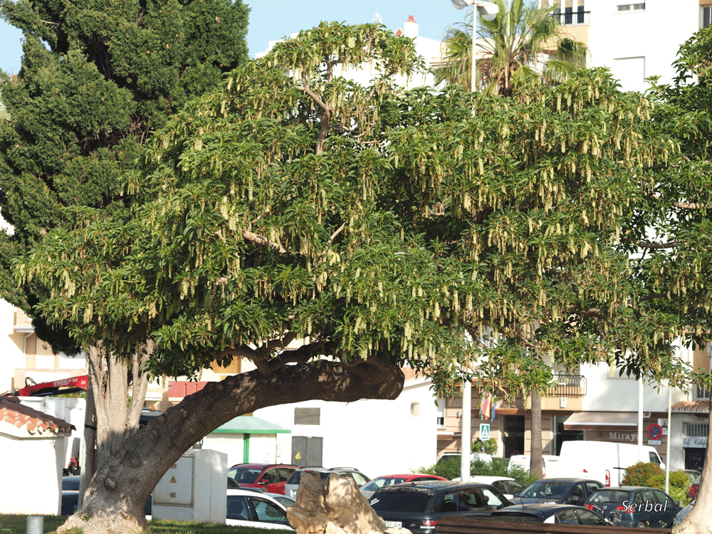 Al ser un árbol dioico, las flores masculinas y femeninas están separadas, es decir, hay árboles masculinos y árboles femeninos, siendo las flores ligeramente distintas; las flores se disponen en racimos colgantes de la longitud aproximada de las hojas; las flores masculinas tiene en la base 5 sépalos persistentes, ovados, de color amarillo pálido, dentro 20-30 estambres con filamento pálido y anteras amarillas, los elementos femeninos están atrofiados; las flores femeninas tiene 5 sépalos de color pálido, ovados y caedizos, dentro unos 10 estilos, estos son recurvados.