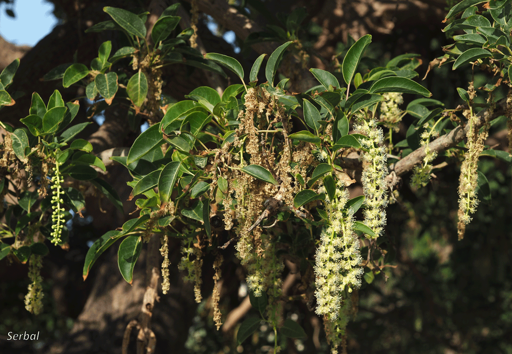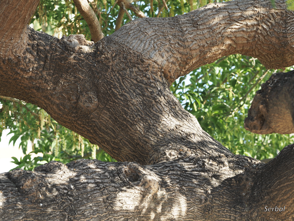 Árbol de copa redondeada y tronco gris, grueso y grieteado, ramas también son gruesas; dentro del conjunto llama la atención la base del tronco, esta se ensancha y expone la parte superior de las raíces, creando huecos y elevaciones del suelo a su alrededor.
