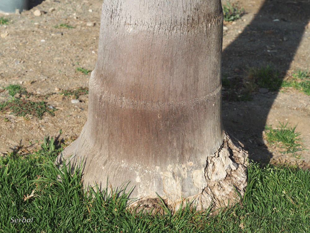 Palmera con tronco largo y liso de color gris, mide unos 50-60 cm de diámetro, puede tener varios ensanchamientos en su recorrido, discretas líneas transversales a intervalos.