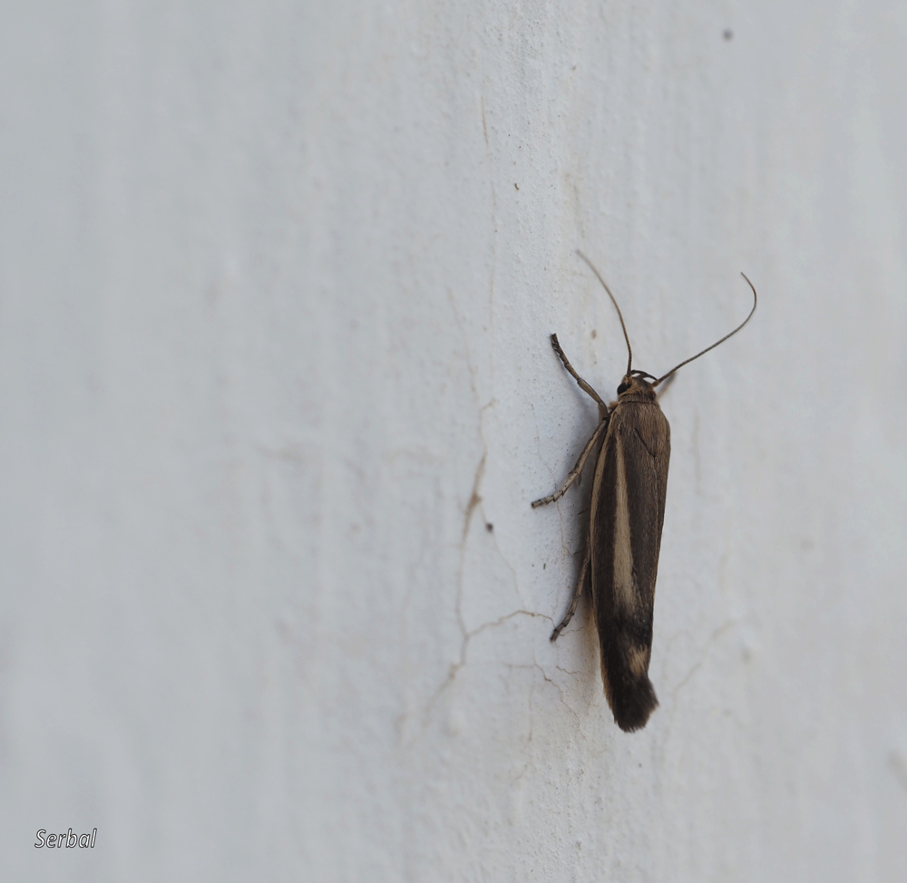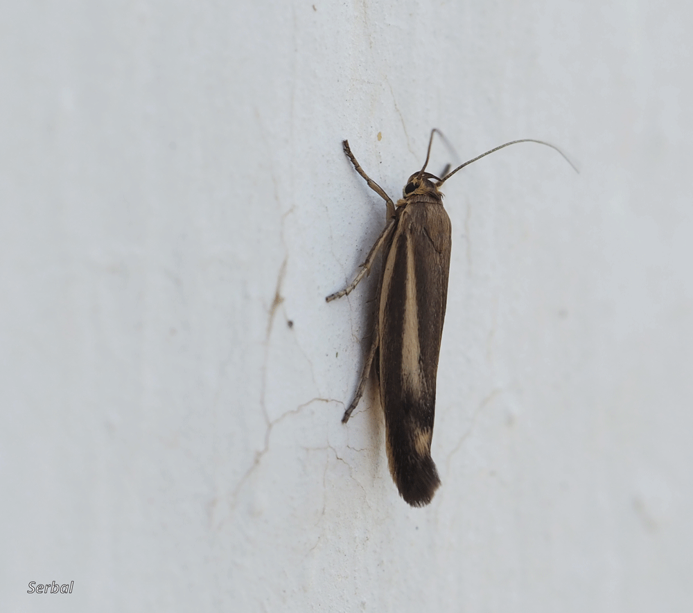 Pequeña polilla de tono general marrón castaño uniforme, destaca un banda blanca en posición dorso lateral seguida de una mancha blanca en posición dorsal al final de las alas delanteras, justo antes de las fimbrias; en este ejemplar hay una franja blanca en posición latero inferior que no veo en otros ejemplares de esta especie, por lo que ofrece dudas su identificación, siendo solo probable, en la Península Ibérica hay 92 especies de este género, de las cuales una buena parte sin fotos en la red.