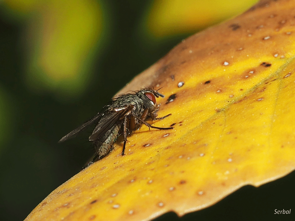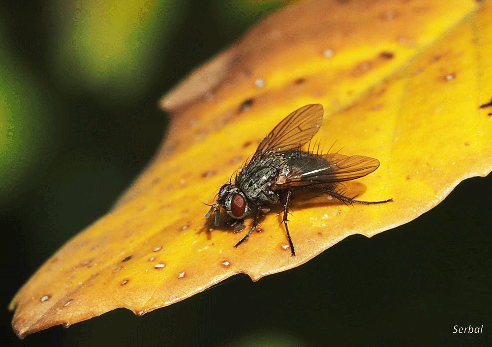 Mosca con color general gris, gris dorado en el abdomen; presenta vello setáceo e hirsuto en cabeza, tórax y abdomen; ojos de color rojo intenso, antenas de color gris con una cerda en su cara superior; alas hialinas con venación oscura, tégulas anaranjadas; patas con fémures rojizos rojizas con tarsos oscuros; si se observa la venación se pueden ver como la vena media y cubital (tras la celda que forman) se prolongan hasta el borde alar, tocándolo la cubital y no llegando la media; sobre el tórax también se pueden observar dos pequeños trazos negros longitudinales en zona proximal y un par de marcas pequeñas triangulares en posición dorsolateral.