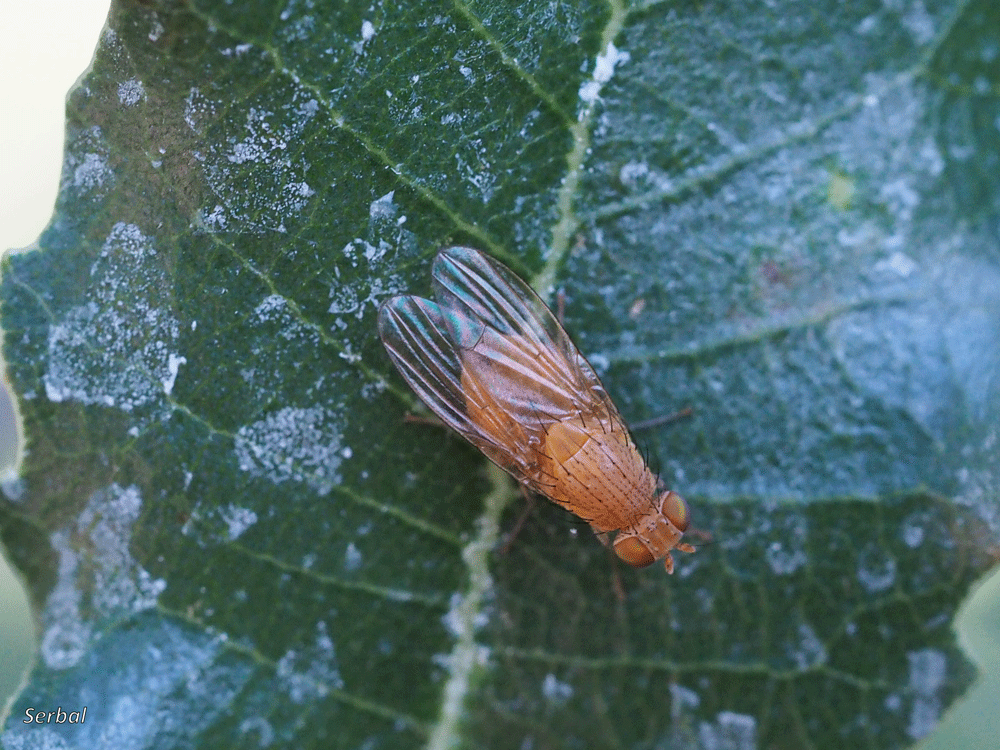 5 mm. Pequeña mosca de la familia Lauxaniidae; se distribuye por la mayor parte de Europa, presente en la Península Ibérica.