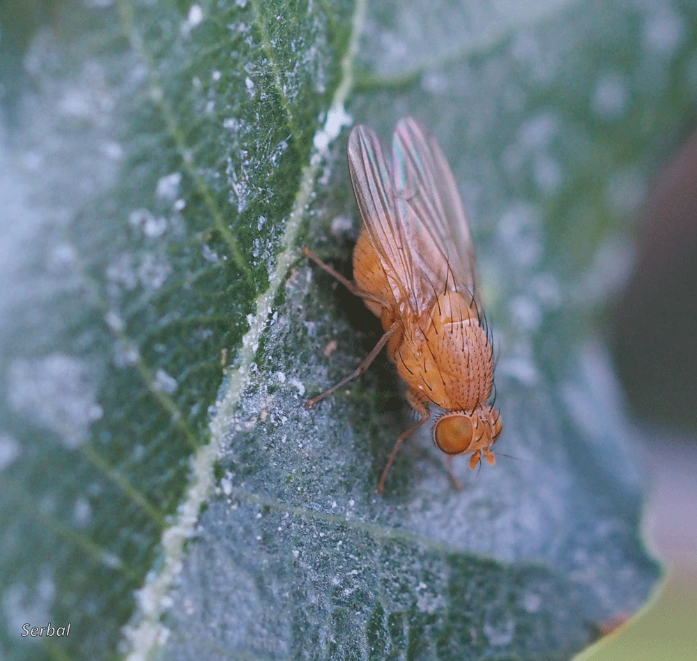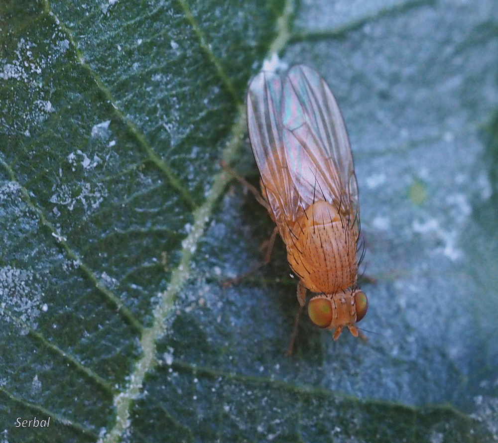 Mosca de color naranja; antenas pequeñas con una cerda sobre ella, las antenas no están manchadas de negro; ojos grandes anaranjados bien delimitados, triángulo ocelar con dos cerdas , estas cerdas están insertadas fuera de la línea que una los tres ocelos; tórax con fila de tres cerdas sobre su dorso (scutum) y ninguna sobre el prescutum; alas hialinas con venación oscura; abdomen ovalado con dos puntos negros en posición dorsolateral de tamaño variable; patas anaranjadas pálidas sin oscurecerse.