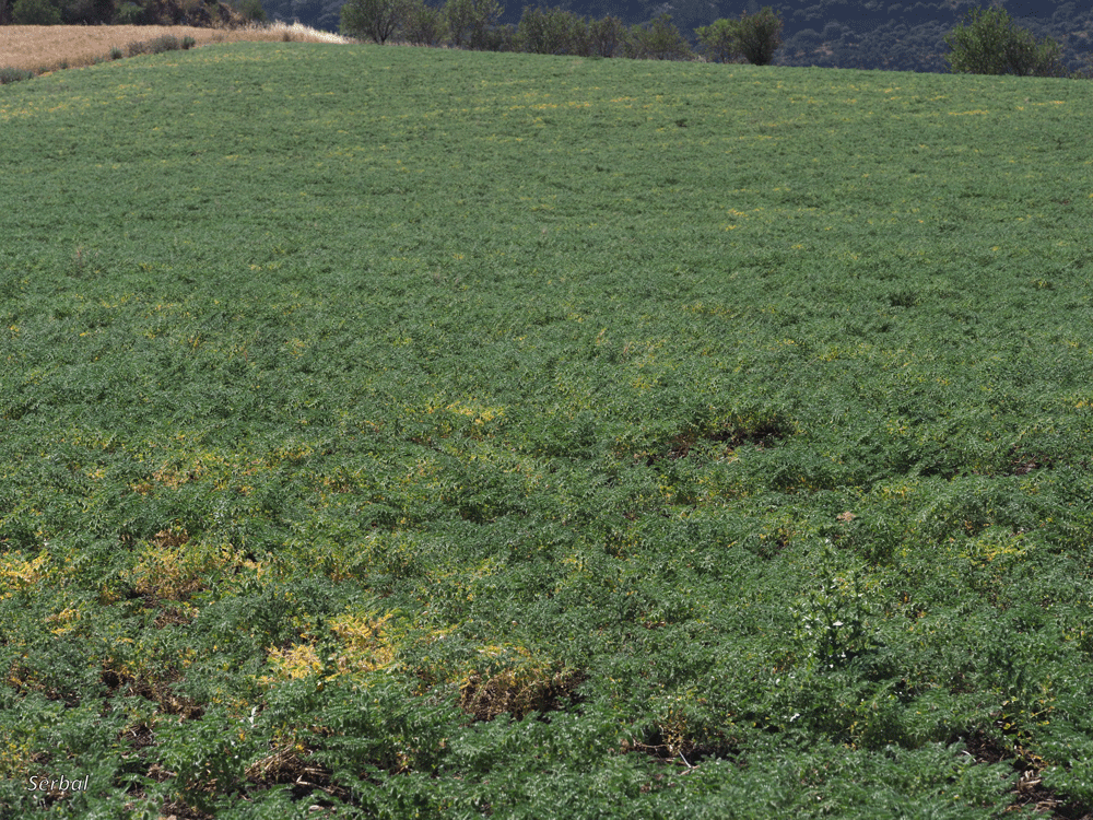 20-50 cm. Herbácea anual de la familia Fabaceae; es originarios del este del mediterráneo y del suroeste de Asia, desde aquí se extendió su cultivo rápidamente a toda la cuenca de mediterráneo y posteriormente a las zonas secas y cálidas de buena parte del mundo; en la Península Ibérica se cultiva desde la antigüedad.