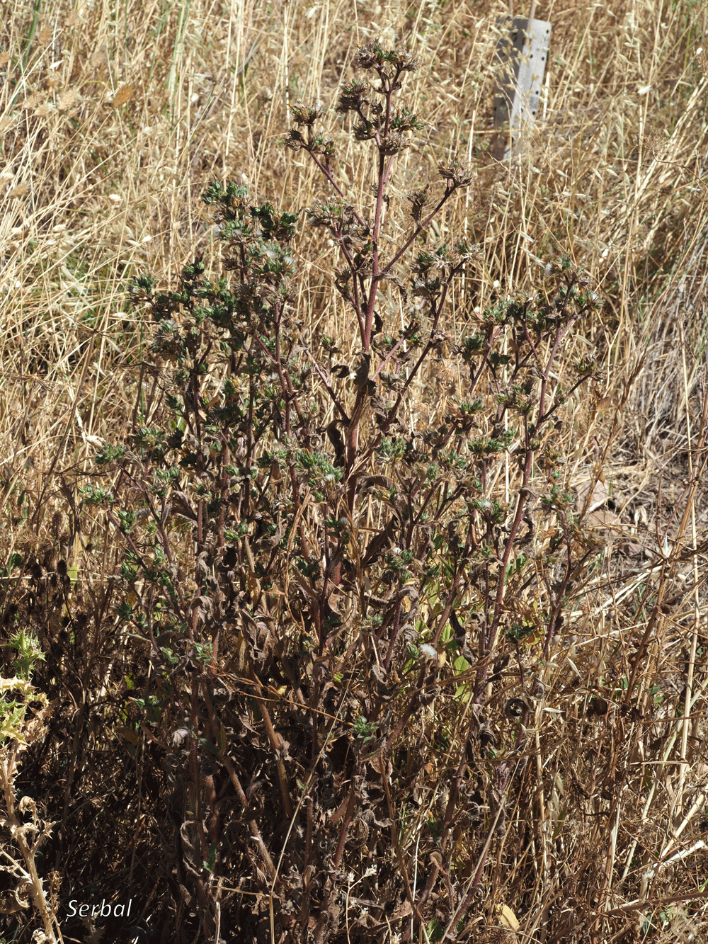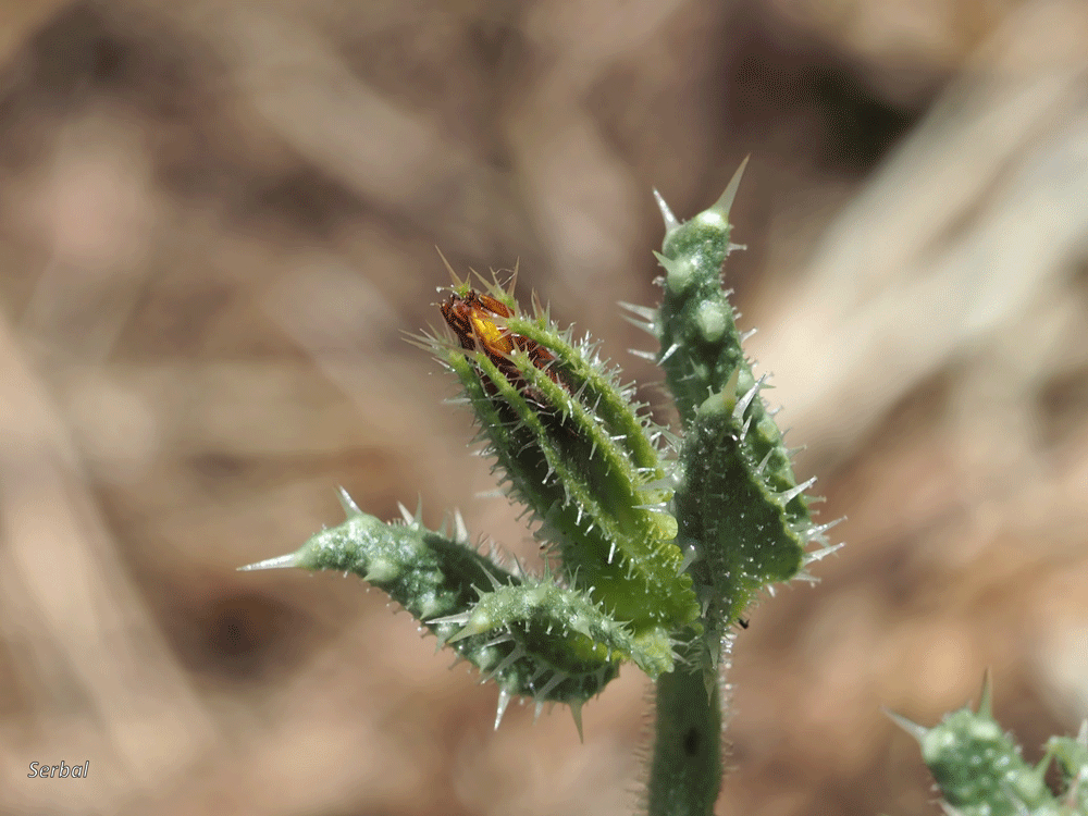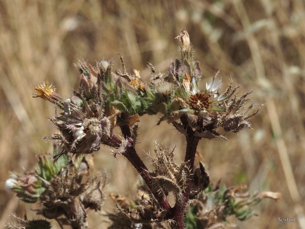 Planta de porte erecto o erecto ramificado, brota tras las lluvias otoñales, en algunos casos bianual, rebrotando desde el viejo tallo; es una planta cubierta en todas sus partes de vello rígido, lo que le proporciona un tacto áspero y desagradable, casi punzante; tallo aristado y con tinte violáceo al final de su ciclo de vida.